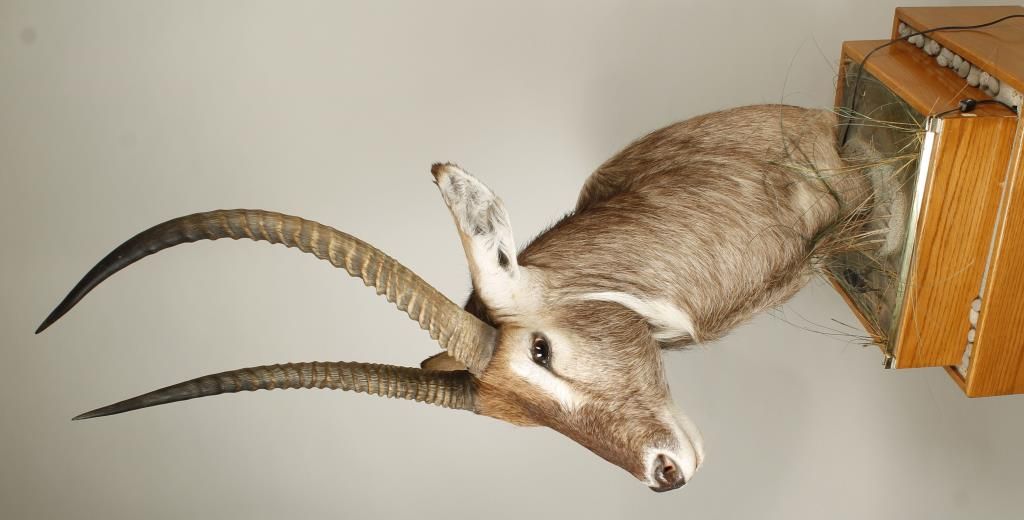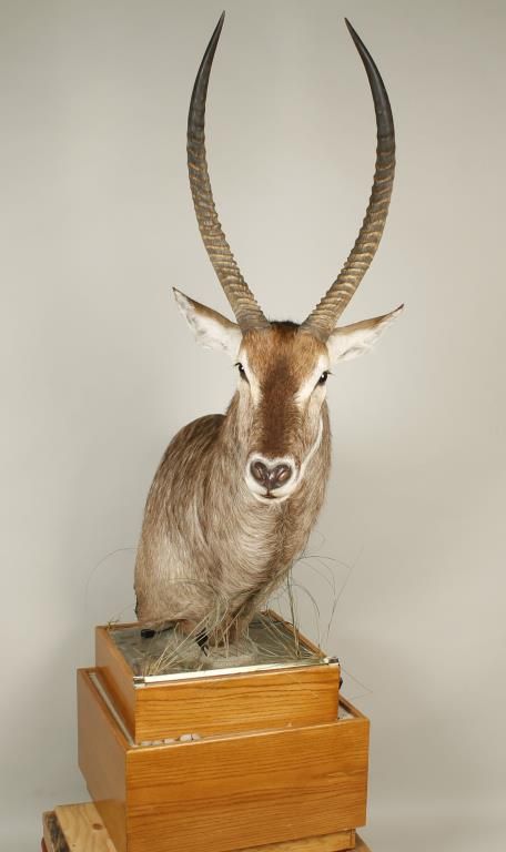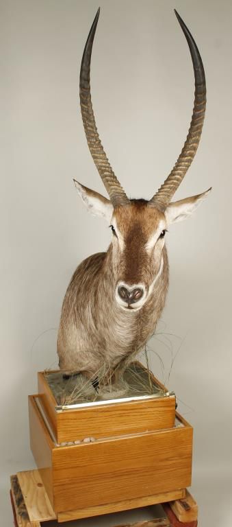 Taken in Midlands in 1993. Two level pedestal measures 22"Lx24"Wx20"H. Approx measurements without pedestal are as follows: Overall height including horns: 57"; Widest point of body: 15"; Back to Nose tip: 35"; Crown to Left horn tip: 25"; Crown to Right horn tip: 25"; Horn tip width: 9 1/2". "Tony DaCosta Collection" of noted hunter and owner of Safari Headquarters Ltd. from Carson City, NV.
