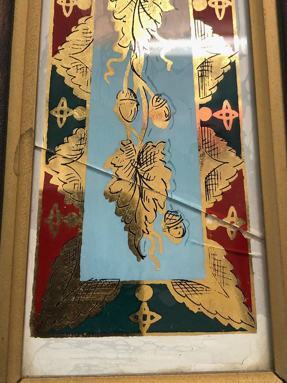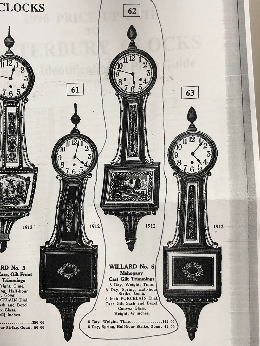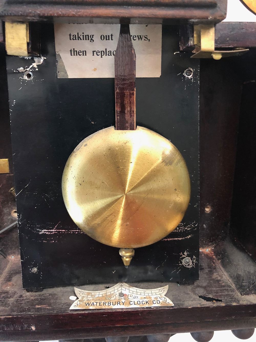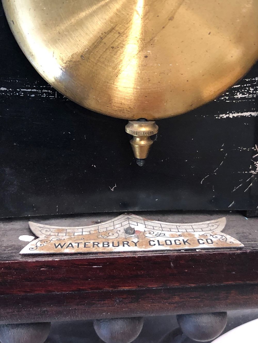 Waterbury Clock Co., weight driven with porcelain dial, called The Willard. Has a wonderful label inside lower door, all original, has slight age line on throat glass. Was in running condition at the estate. From the Chatham, Ma., Cape Cod Collection.