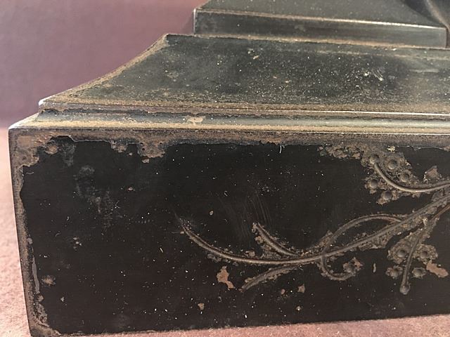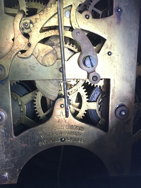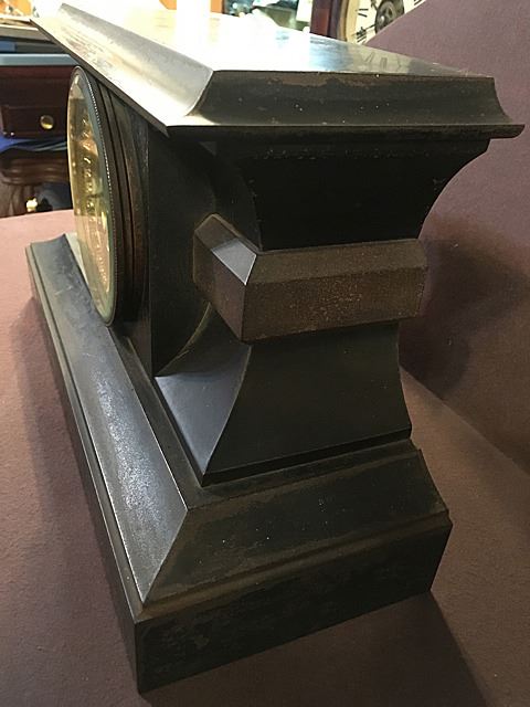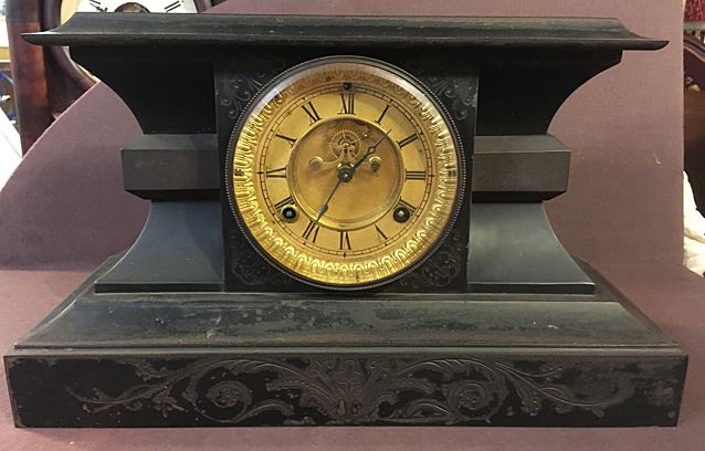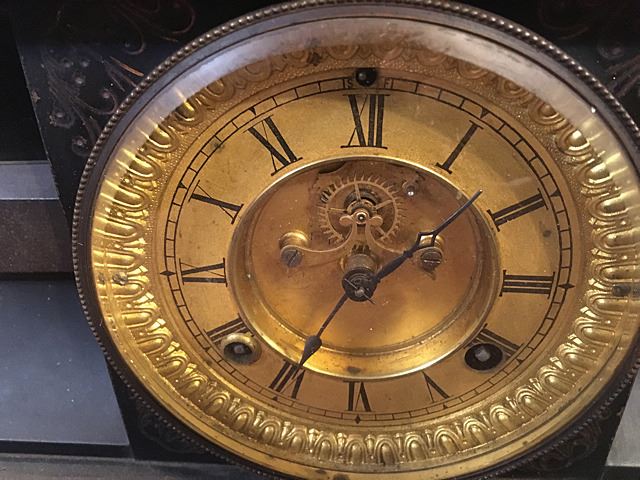Waterbury Clock Co, Waterbury, CT, cast iron mantel clock with ornate gold dial, engraved base and at corners of the clock face, works stamped "Waterbury Clock Co.", measures approx. 10 1/2" x 16 1/2" x 6 1/2"