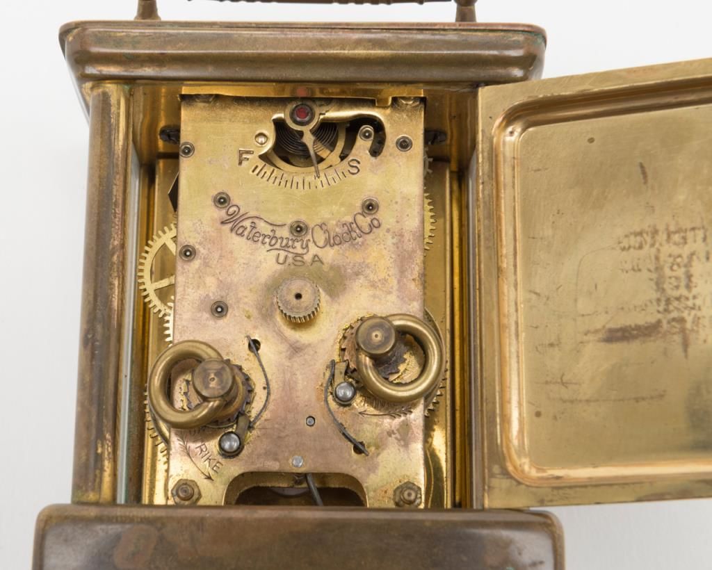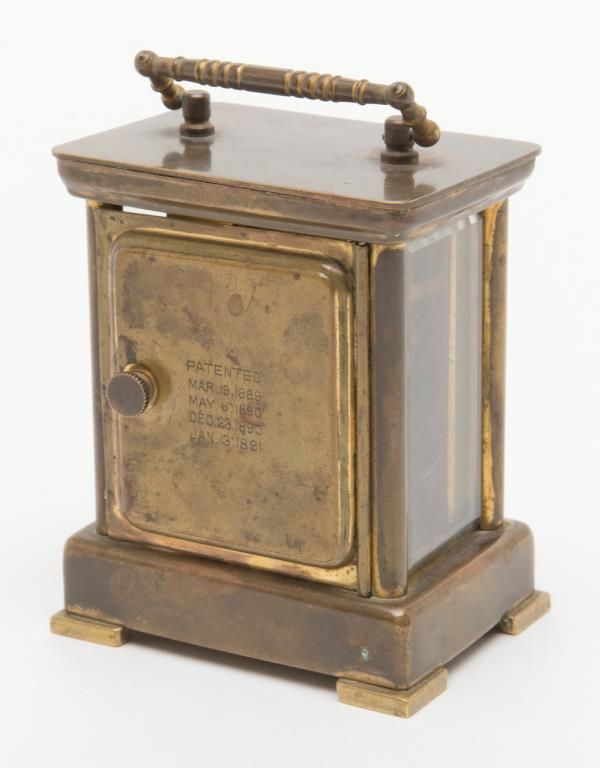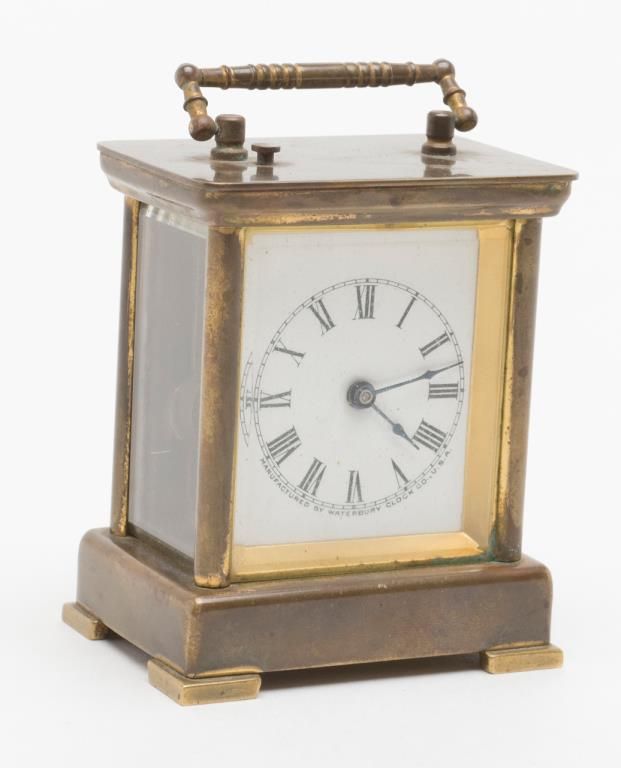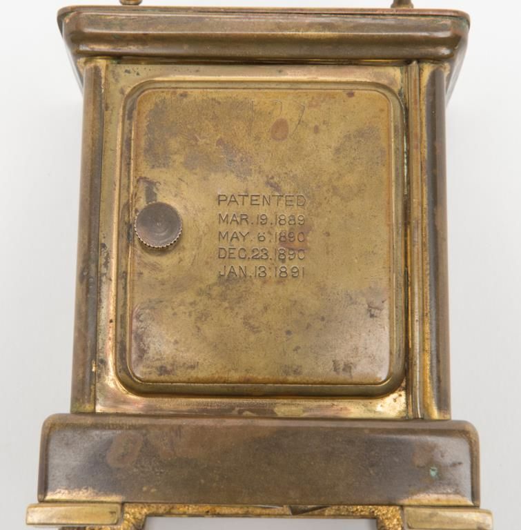 Waterbury Clock Co. carriage clock with last patent date “January 13, 1891”; has ringer, wound to tight and not working but intact. Est.: $100-$200.