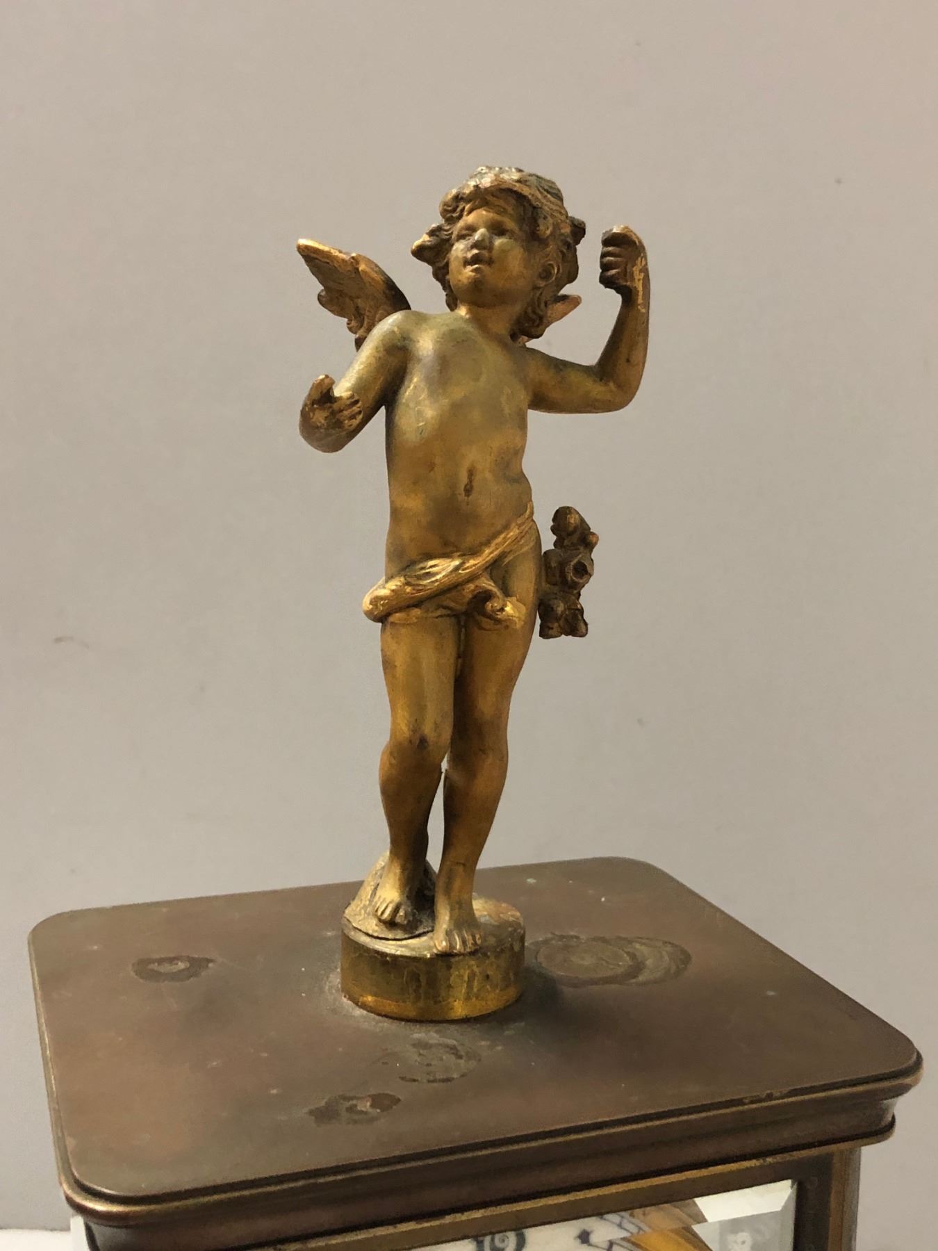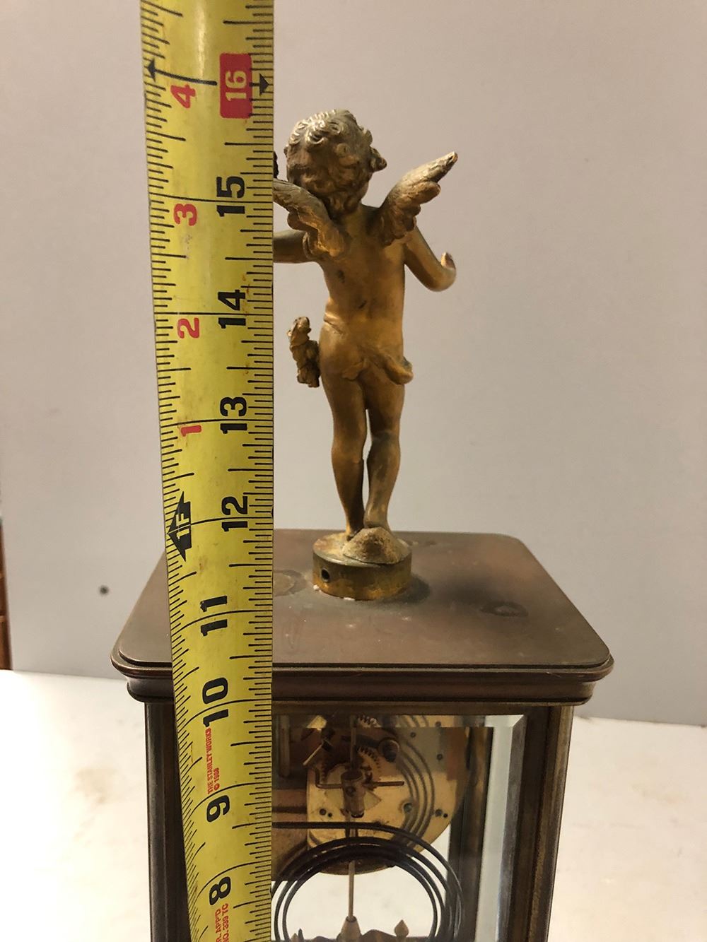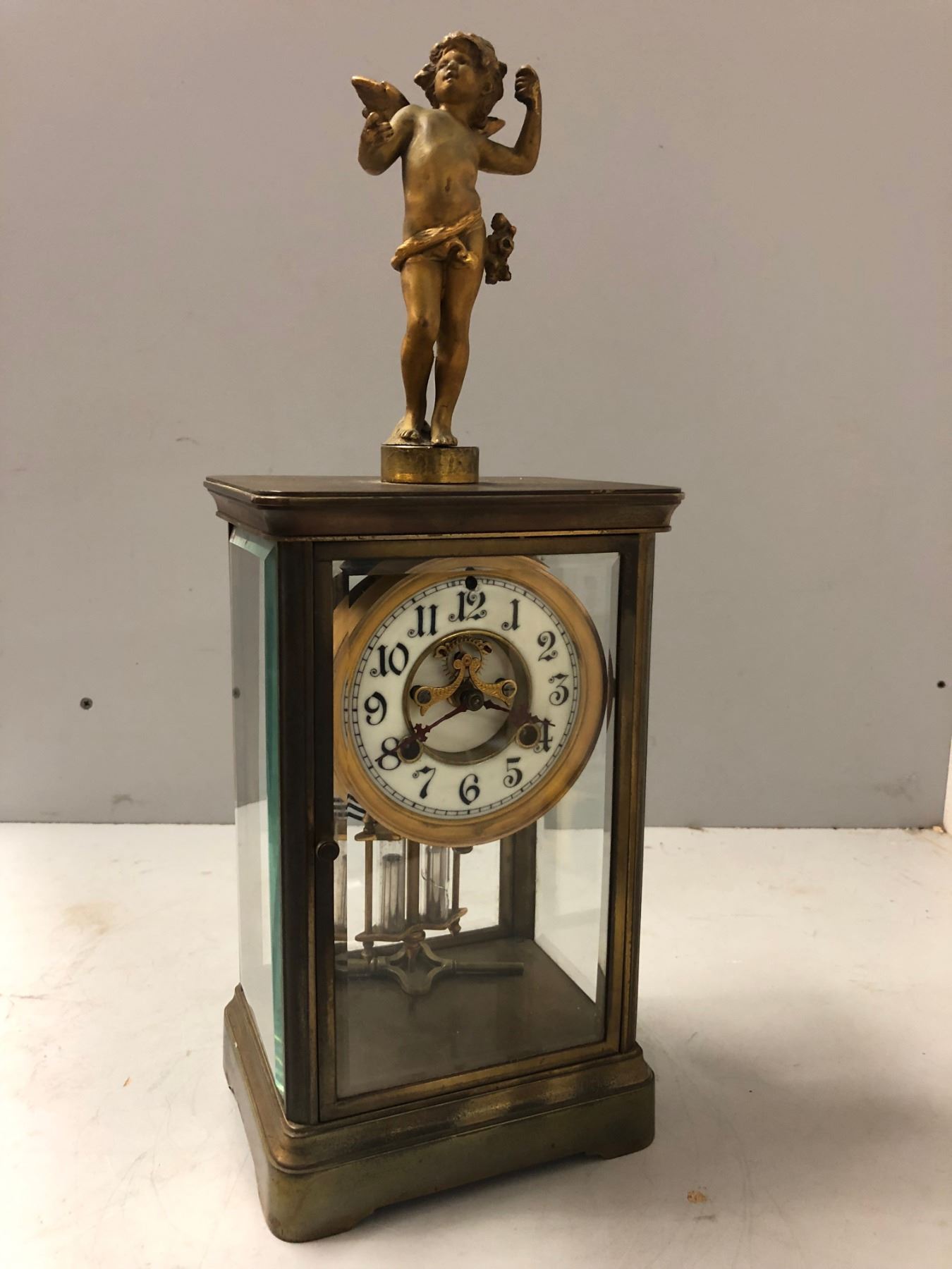 Waterbury Clock Co. Crystal Regulator clock with standing Cupid top. All original with open escapement movement, slight crack on pendulum. Was in running condition at the estate. From the Chatham, Ma, Cape Cod Collection.