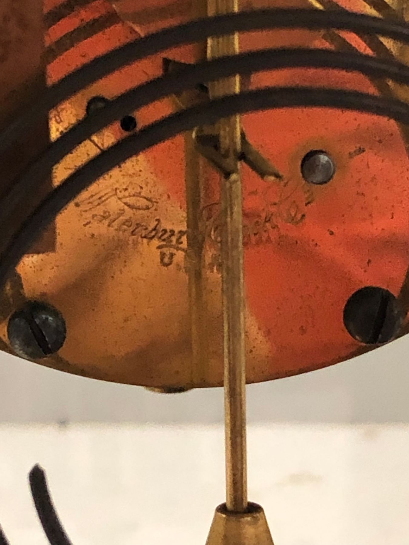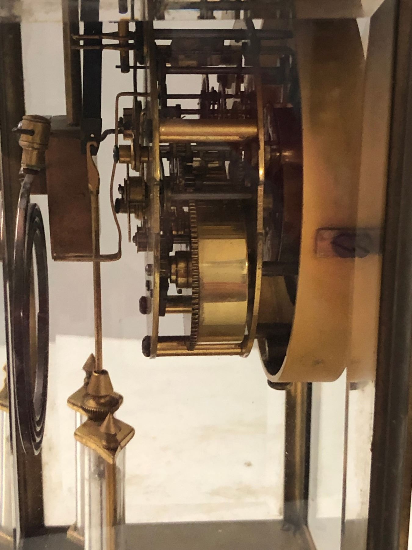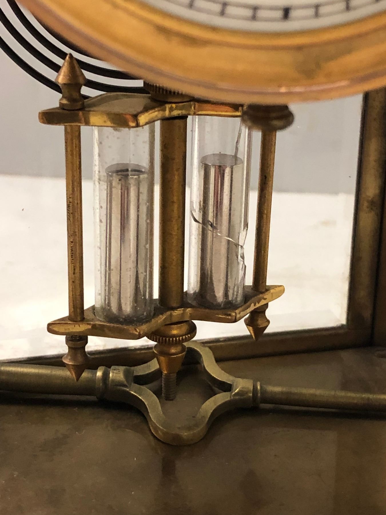 Waterbury Clock Co. Crystal Regulator clock with standing Cupid top. All original with open escapement movement, slight crack on pendulum. Was in running condition at the estate. From the Chatham, Ma, Cape Cod Collection.