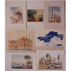 VARIOUS, seven, each a watercolor on paper, signed, some possibly Greek, various sizes from 6 x 7 1/2" to 10 x 13", some with foxing speckles, some mounted to card. (7) STARTING BID $20. ESTIMATE $20 TO $1000