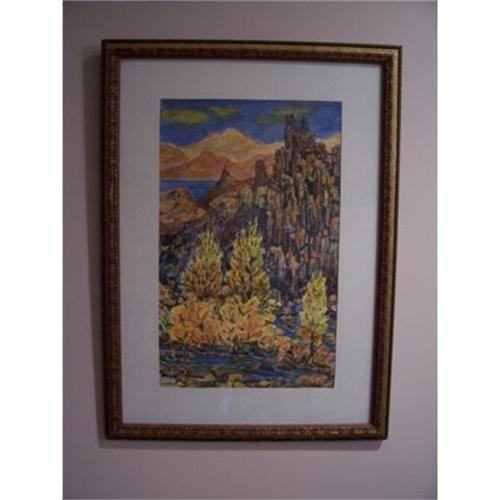 This fantastic watercolor painting was exhibited at a show for the Nevada State Council for the Arts. It sold at this show for $1,100.00 The artist is Doris Sue Bell of Carson City, Nevada. It comes beautifully framed with the visible area of the painting at 18 1/4 X 11 1/4 inches. Total with frame is 26 in. X 19 in. The show sticker is still on the back of the painting as well as Casselman sticker who was the framer.