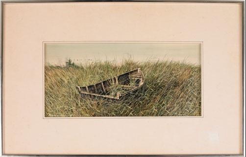 Ronald Ekholm, (American, b. 1942) watercolor landscape with boat, signed lower left, 8 1/2 x 18.