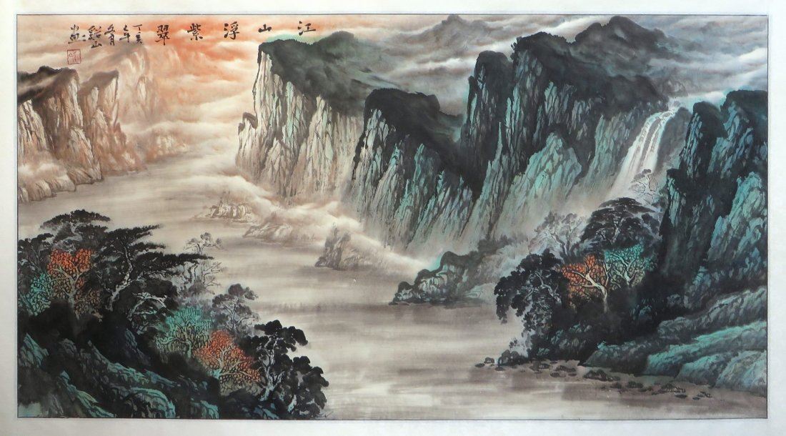 Sight: 52" X 26 1/2". Calligraphy and artist's mark/seal on upper left. Rolled for shipping.