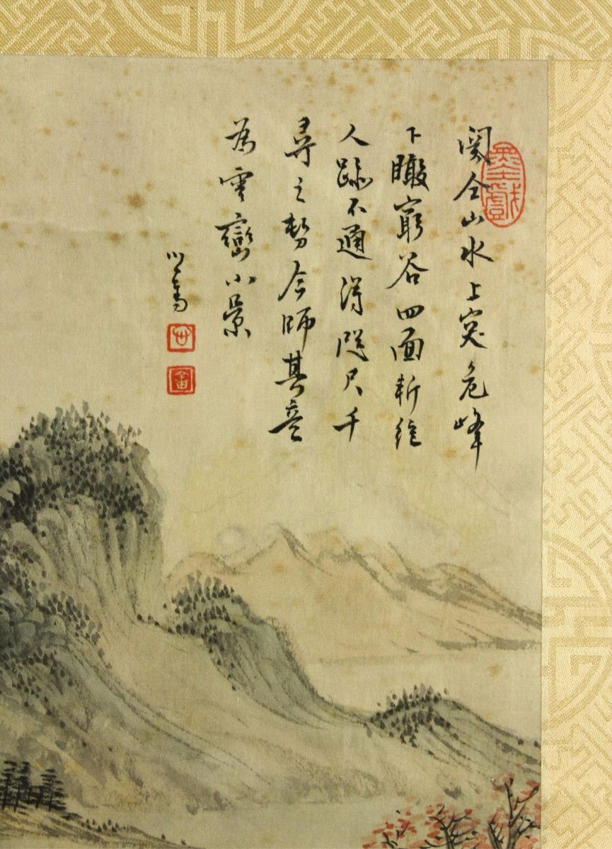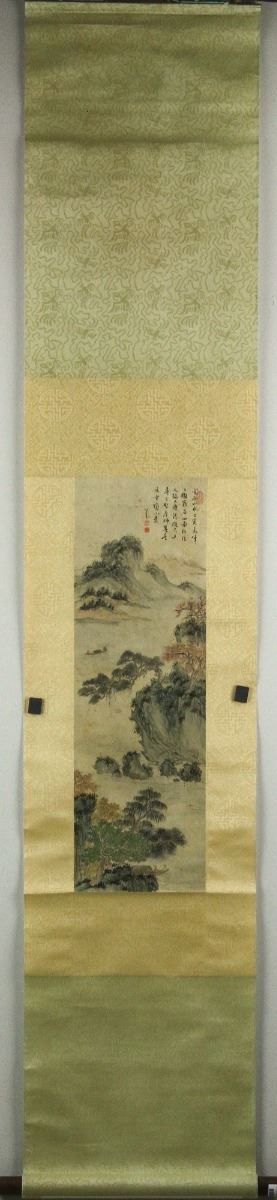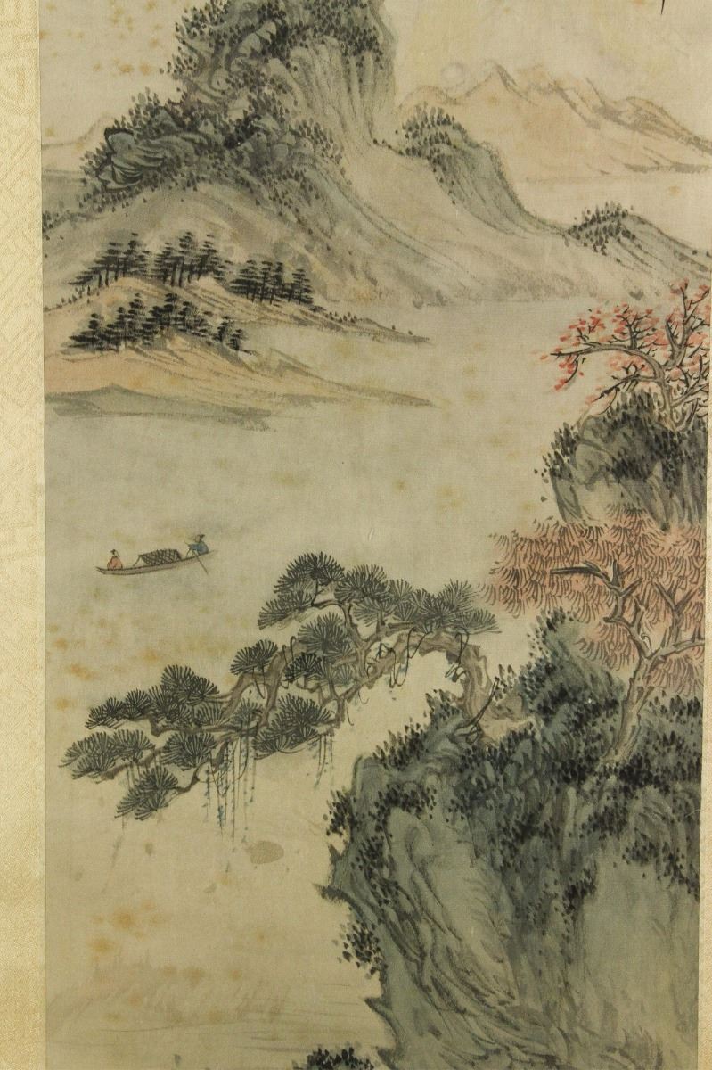 Landscape; along with script calligraphy; Chinese ink and watercolour on paper; hanging scroll; signed Pu Ru and inscribed with three seals; 62.5 cm X 19.5 cm
