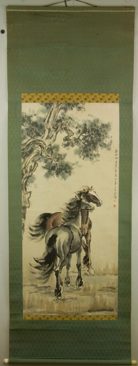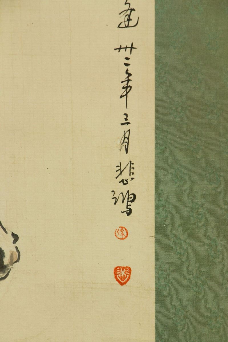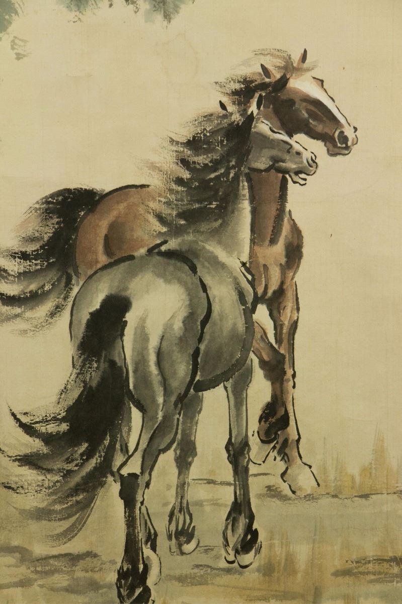 Two horses resting under the pine tree; Chinese ink and watercolour on paper; hanging scroll; signed Xu Beihong and inscribed with two artist seals; 112 cm x 51.5 cm