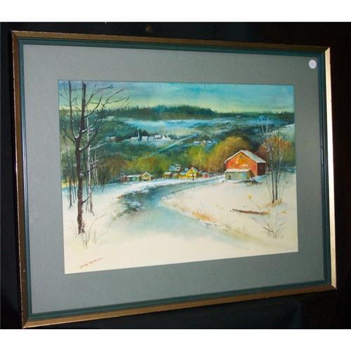 <tr><td>Title:Watercolor Red Barn in Winter Oil Painting Sgn.</td></tr>