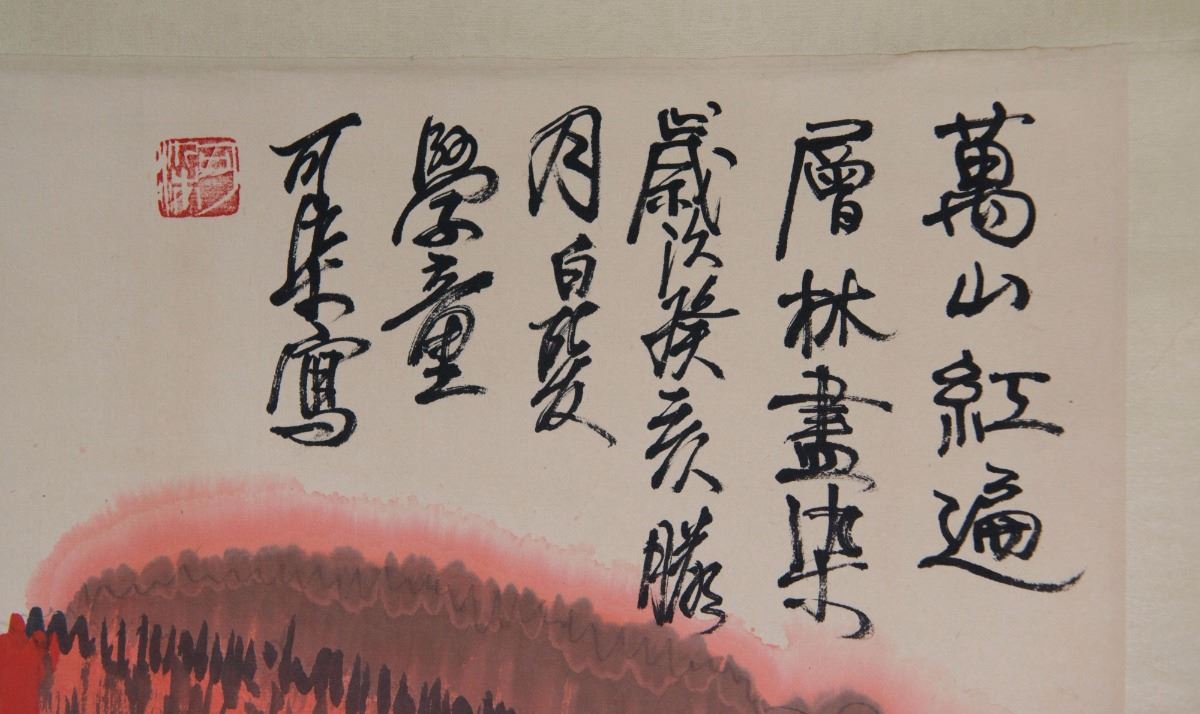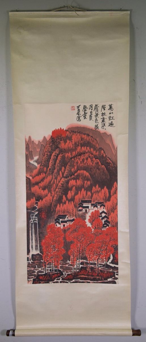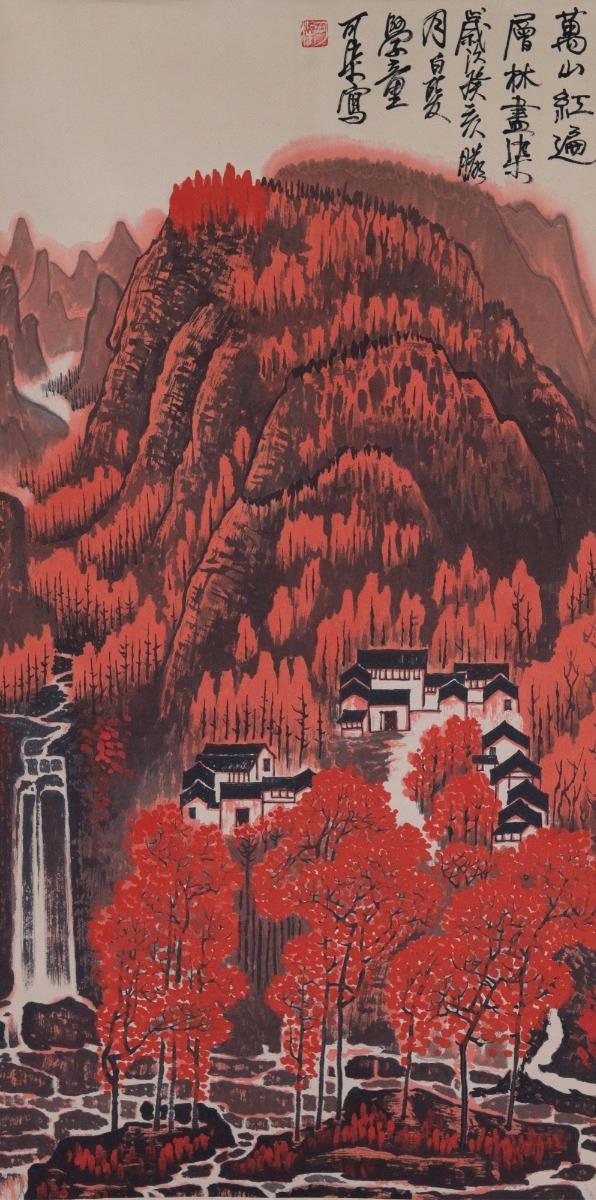 Red village scene; Chinese ink and watercolour on paper; hanging scroll; signed Li Keran (1907-1989) and inscribed with one artist seal; 93 cm x 48 cm