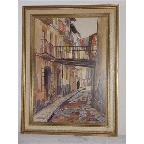 A framed street scene watercolor, 21 1/2" X 16 1/4", nonglare glass. Signed lower right. Paper label on back reads: Willard's, 125 North Church Street, West Chester, Penna. 19380