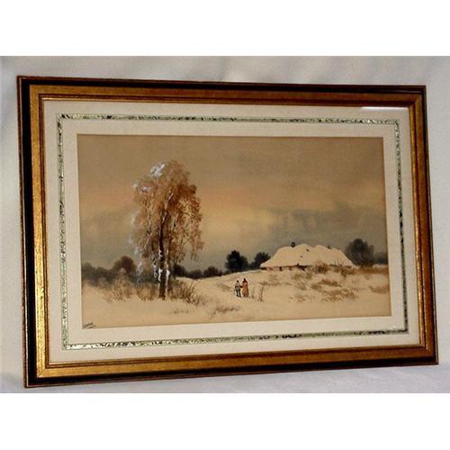 A framed watercolor,22" x 32", Image 14" x 24". winter scene with decorated matt. Signature unreadable.