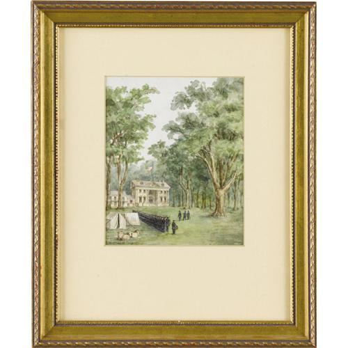 <B>Watercolor of Union Troops Drilling by Charles M. Jenckes.</B></I> This 4½” x 5½” watercolor was done by the noted artist Charles M. Jenckes in 1896. The picture uses watercolors for the background foliage of this scene depicting Union soldiers drilling in front of what appears to be a Southern mansion. This is actually an 1861 camp at Elm Park, New York. A United States flag flies atop the mansion with the troops in front of their pitched tents. Barrels and crates of supplies lie beside the tents giving the overall impression to the viewer that these are Union troops during the occupation of the South during the Civil War. <BR><BR>The artist makes good use of the green tones in the grass of the drilling grounds and the trees which are thick and full. The watercolor is matted and in a 9¼” x 11¼” gold wooden frame. This is an appealing picture of a scene common during the Civil War. <BR><BR><B>Provenance:</B></I> <I>The Tharpe Collection of American Military History</B></I> <BR><BR><B>Exhibited:</B></I> <I>The Liberty Heritage Society Museum</B></I><BR><BR><b>Shipping:</b> Framed - with Glass, Small (<a target="_blank" href="http://www.heritageauctions.com/common/shipping.php">view shipping information</a>)