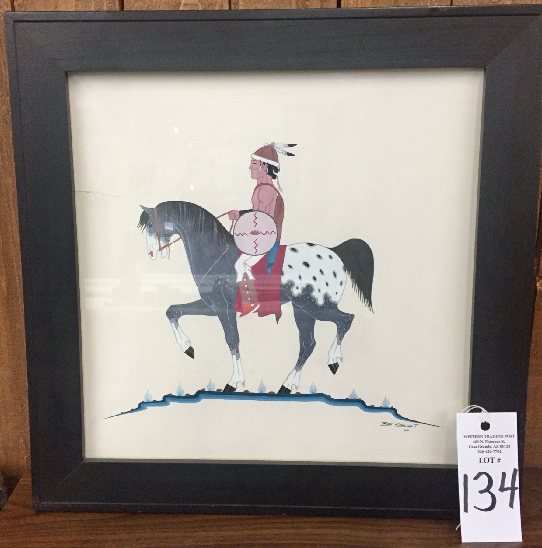 Description: For your consideration we offer for sale this framed original watercolor featuring a Native American man on an Appaloosa Horse. It was created by the artist, Ben Stewart. Maker: Ben Stewart. Approx. Age: Vintage. Size: 17”w x 17” tall with frame. Condition: Pretty good for its age, normal wear and fading expected and there is a little crinkle to the board the art was painted on. Please look closely at the pictures - they are an important part of our description. Shipping: There will be a $10 handling / packaging fee for shipping this lot. The actual cost of postage will be added on top of that.