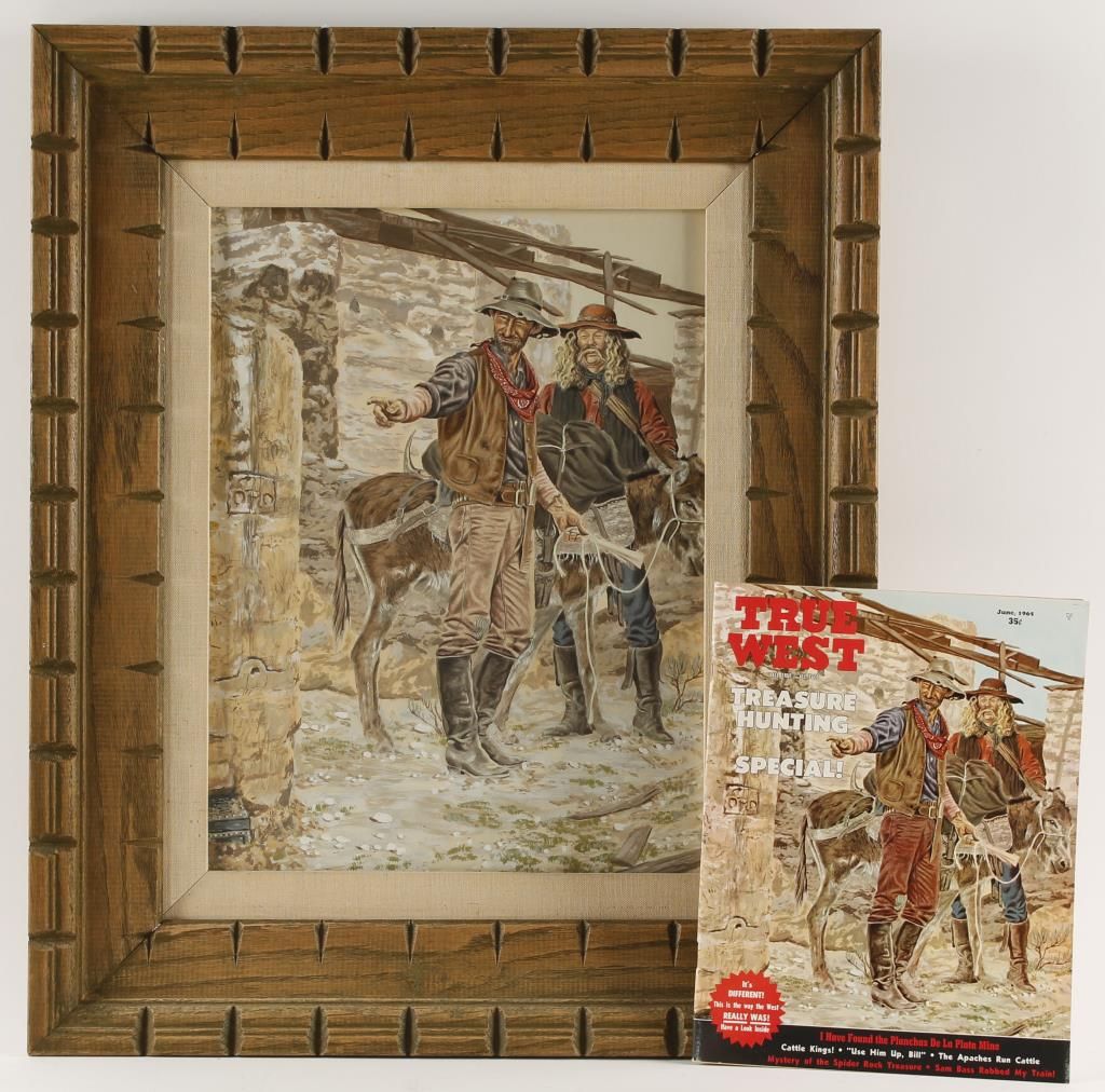 Depicting two cowboys and their mule. The painting was used as the cover of True West magazine in June 1964. A copy of the magazine is included. Image size 12" x 16". Framed 19" wide x 23-1/2" high. The artist was born as a third generation Texan in Dallas during 1929. He studied at the Aunspaugh Art School in Dallas during 1947. From 1965 to 1991, he was active as a sculptor, illustrator, and painter of portraits, military scenes, and the history of the West. He has been cited for historically accurate depictions of the Dragoons and Cavalrymen of the US Army. In 1974, he was honored with a one man retrospective in the US Capitol. Additionally, he served for one year as the "Official State Artist of Texas" - an appointment by the Texas Legislature. His work has been exhibited by the White House, Lyndon Baines Johnson Collection [Austin],the Harmsen Collection of Western Art [Denver], and the National Cowboy Hall of Fame [Oklahoma City]. His original works are rare and valuable.