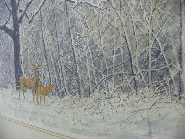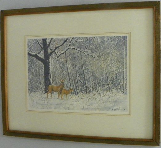 "Deer in Snowy Forest". Approx. 13.75" x 19.75" image, 26.25" x 32.25" frame. From a Riverdale, NY estate. Please read our terms of sale.