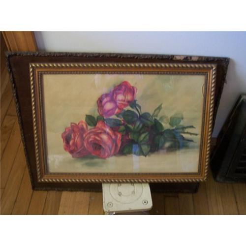 Very pretty and colorful watercolor of roses.This is an older watercolor that has been re-framed.Only problem is there is a piece of glass broken out on the top right side.When it is hanging you really do not notice it so much.I did not want to take all the backing off to replace the glass,so I am selling it as is.Does not affect the watercolor.Measures 21 3/4" by 15".