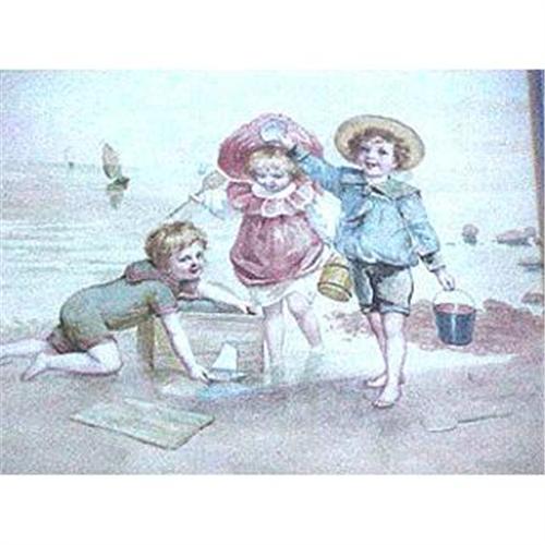 This is a charming Victorian style watercolor signed Hirschberg. The signature and subject matter suggests that the artist is Alice V. Kerr Nelson Hirschberg. She was born 2/12/1856 and died in 1930. She was the daughter of George William Kerr Nelson the Lord of Chaddleworth Manor in Middlesex, England. She was also decended from Elizabeth Kerr a noted English floral painter. Alice was known for watercolors, illustrations, portraits, landscapes and elaborate interiors. She was widely exhibited in the United States. Some of the exhibits were at the Art Institute of Chicago, The Boston Art Club and The National Academy of Artistic Design. She has many listing in art books including Davenport's Art Report, Who's Who in American Art and Dictionary of Women Artists and the Artist's Bluebook. Notes regarding Alice appear in the Smithsonian Archives of Artists along with her husband and son Georges Laurence Nelson. This watercolor painting is 18" wide by 15" high unframed. It has been framed in a polished golden burl wood frame and now measures 24 1/4" wide by 21 1/2" high, framed. The watercolor features three cherubic children enjoying a day at the beach. The subjects are a boy, girl and a baby. This is a lovely watercolor that has been in my collection since late 1980's. I bought from a Connecticut art dealer at Brimfield, Ma. It was unframed and matted under plastic at the time. I had it framed with acid free paper mat covered in striped polished cotton fabic and layed on the surface. ...