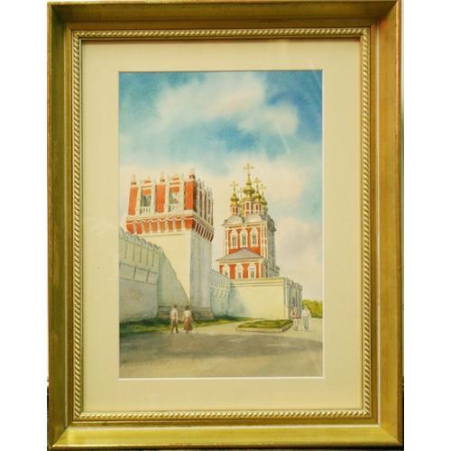 This is a spectacular watercolor of beautiful architecture. A lovely red building adorned with gold crosses and white trim juts out from behind a tall white wall. People walk by on the streets and gaze at the impressive building, which gives the impression that this is an important monument. The red of the building stands out against the deep blue of the sky, and one can imagine that this was painted on one of those perfect days. This would be an excellent watercolor for any history buff to hang in their home.