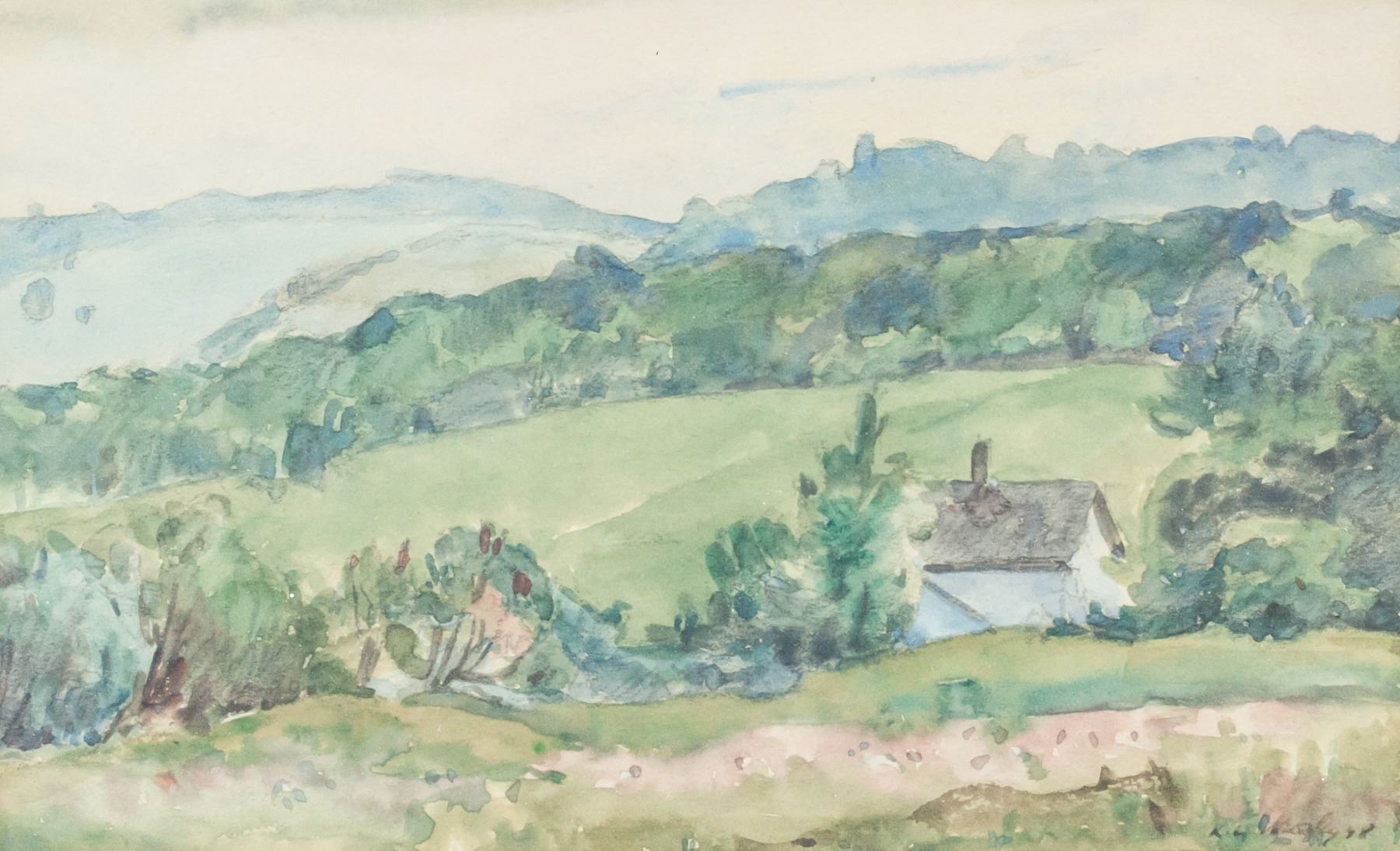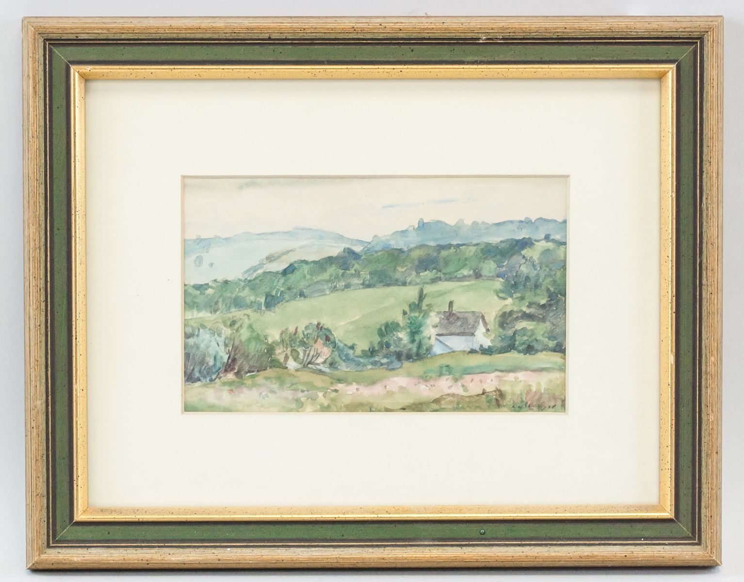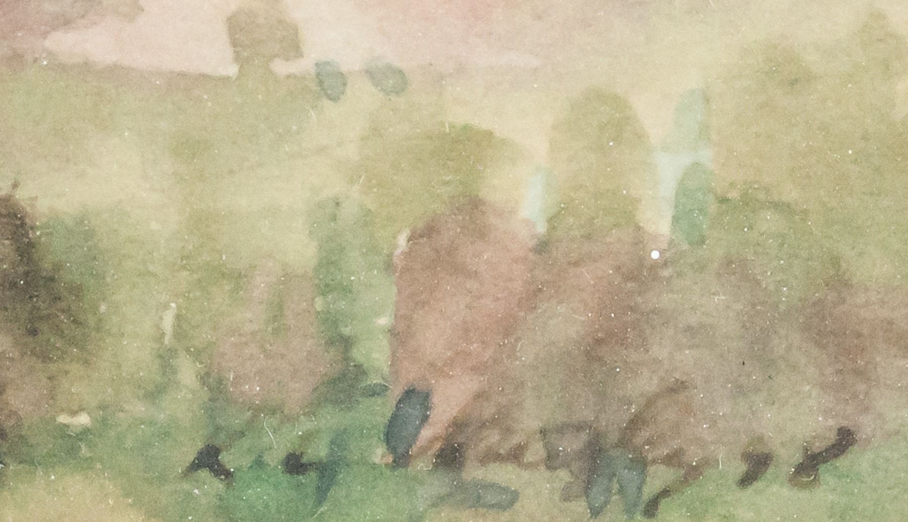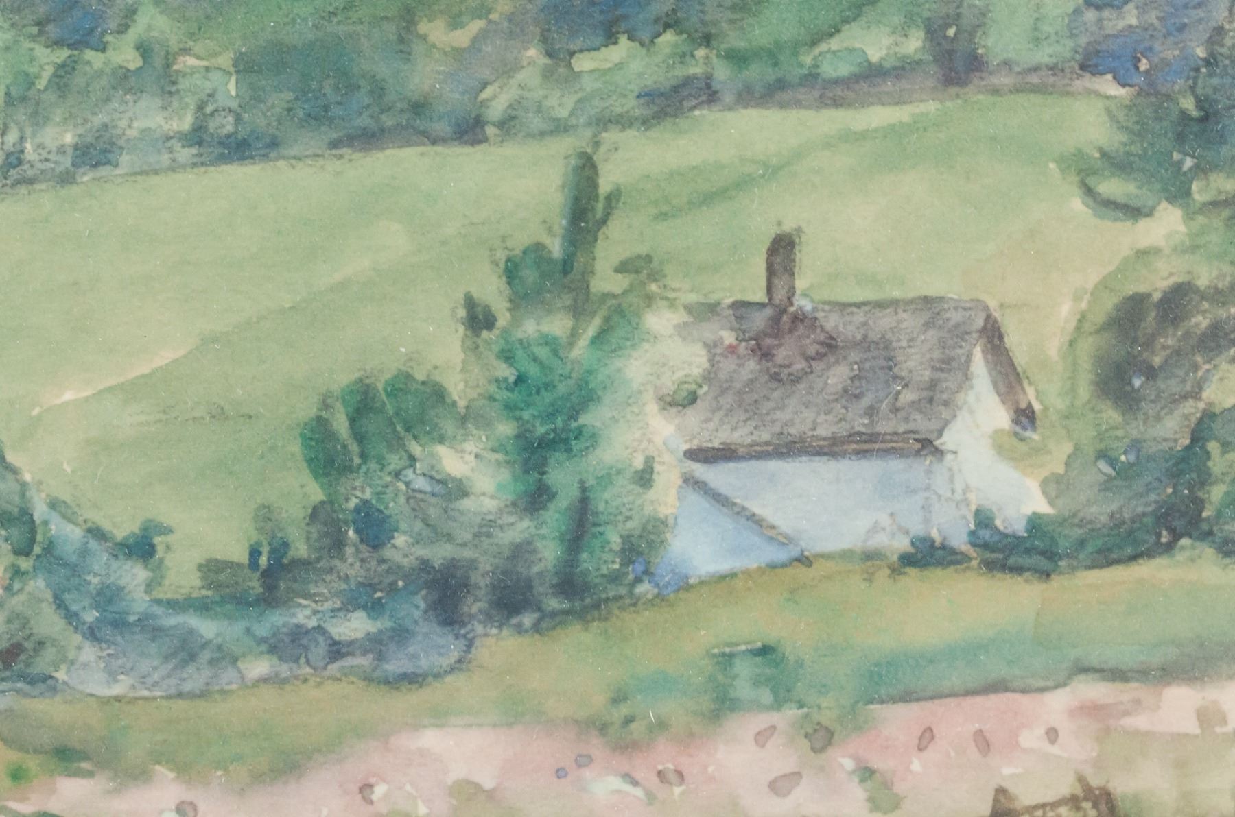 Watercolor on paper, framed. Featuring landscape scene. Signed illegibly in the bottom right corner. 12 x 20 cm (4.75 x 7.75 in), Frame: 28 x 36 cm (11 x 14 in).