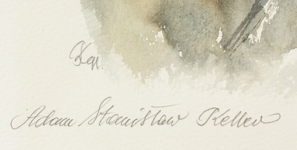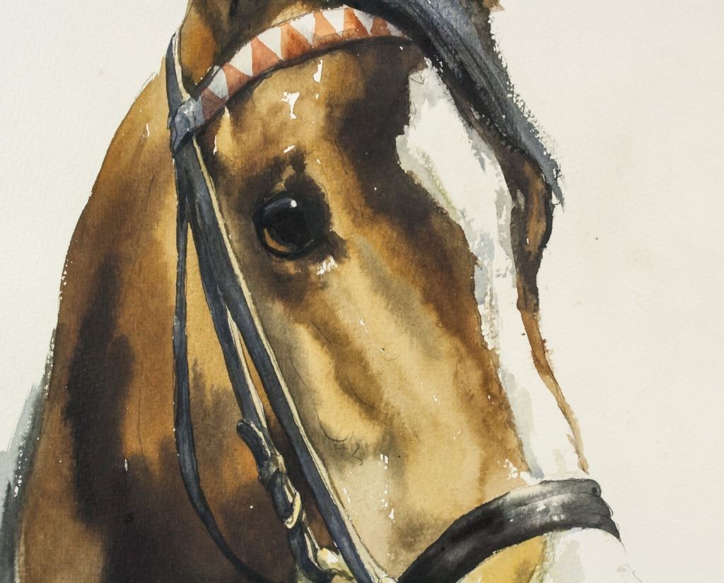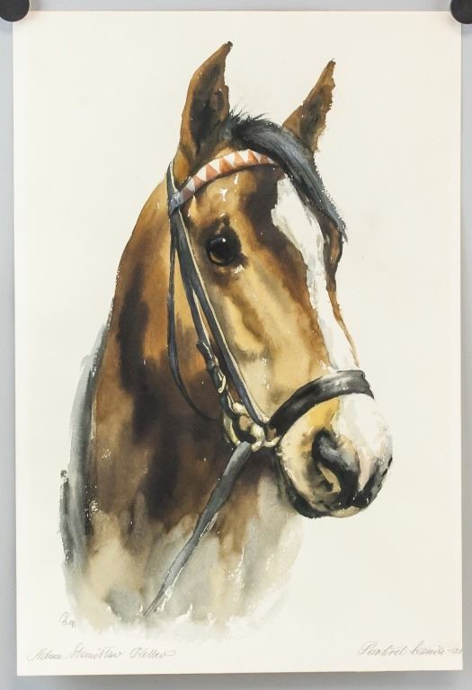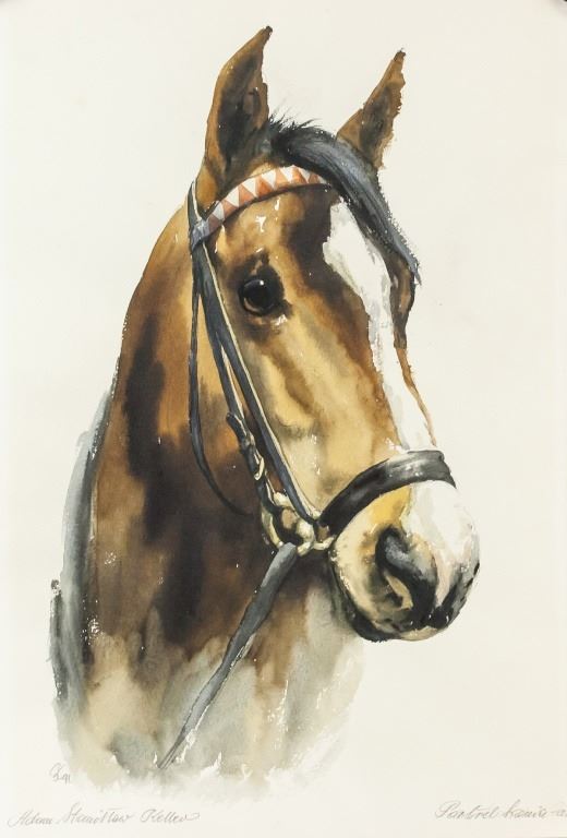 Watercolor on paper. Featuring portrait of a horse. Signed "Adam Stanislaw Keller" to the bottom left corner. 47 x 33 cm (18.5 x 13 in).