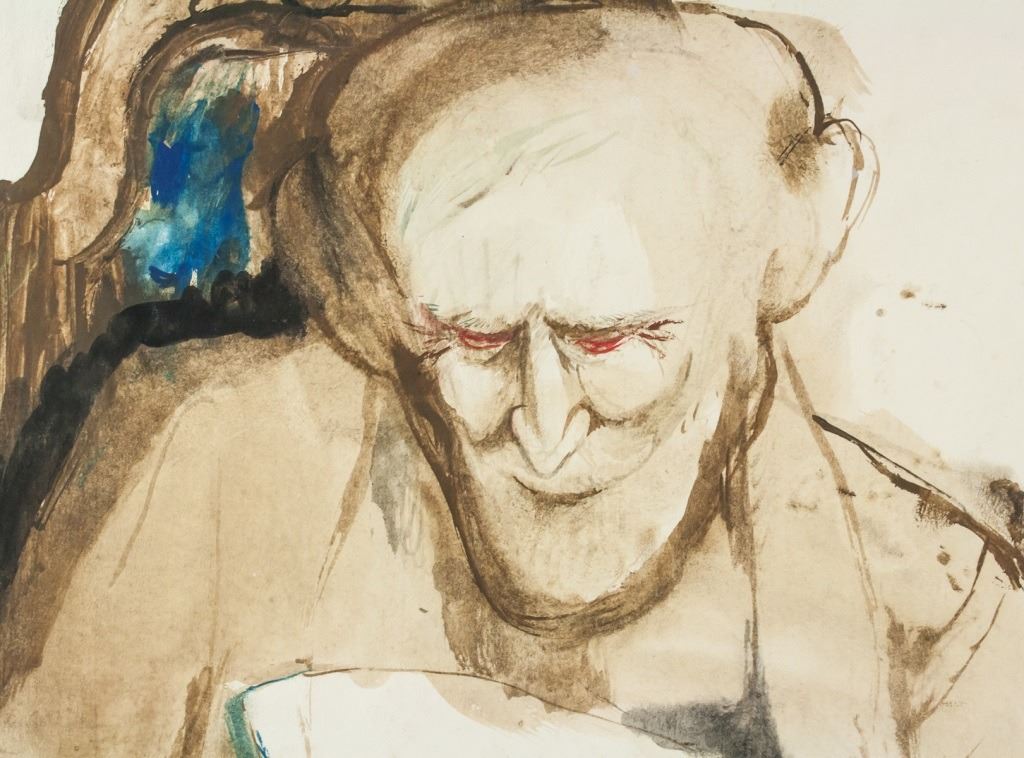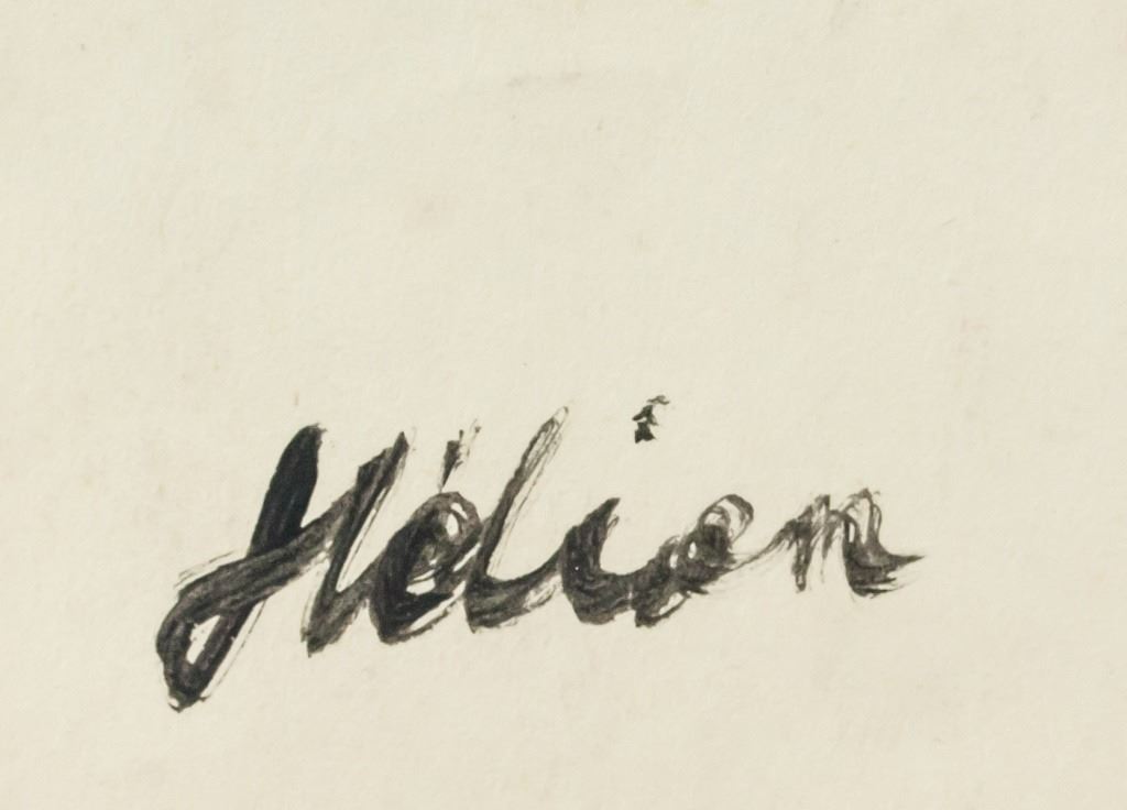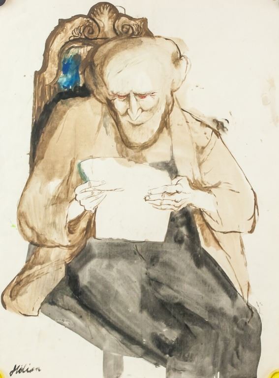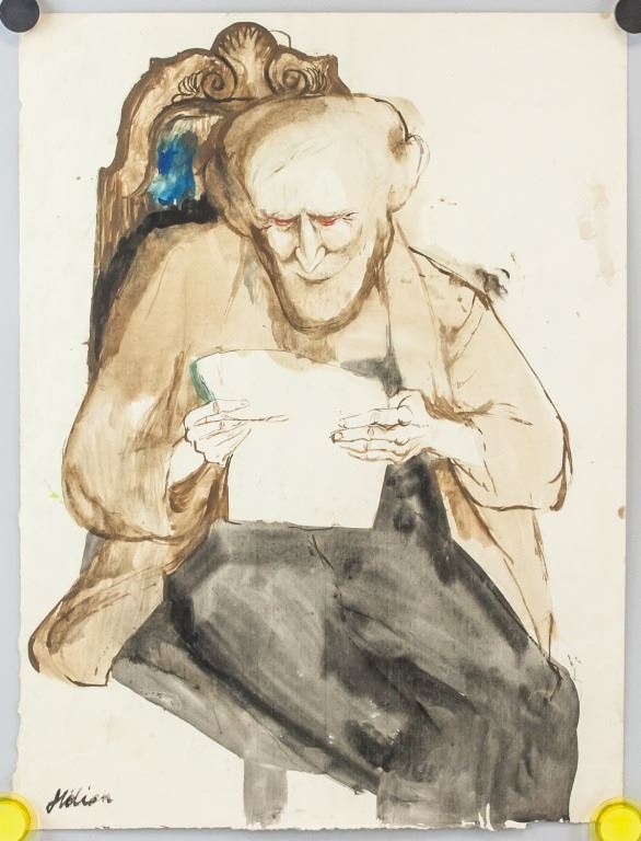 Watercolor on paper. Featuring portrait of an old man sitting in a chair and reading a letter. Signed "Helion" in the bottom left corner. 50 x 37 cm (19.5 x 14.5 inch). Provenance: This lot carries limited provenance from a Southern Ontario estate