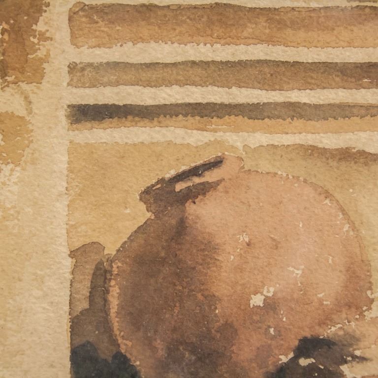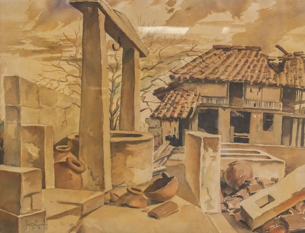 Watercolor on paper, framed. Featuring scene of a rundown building, broken pots, and a well with no rope or bucket. Signed "LEO NOWAK" to the bottom left, with "1945" inscribed beneath the signature. 28 x 21 cm.