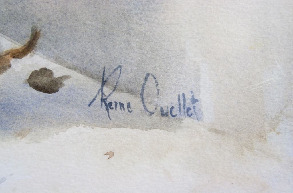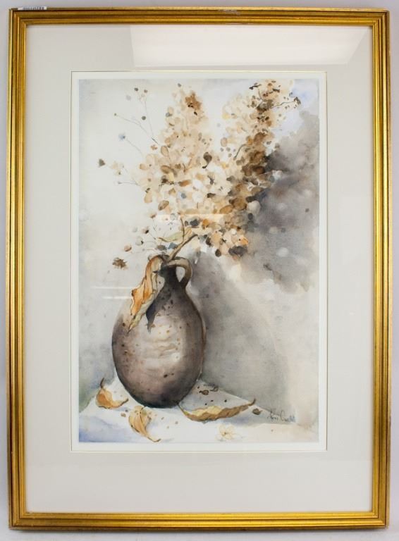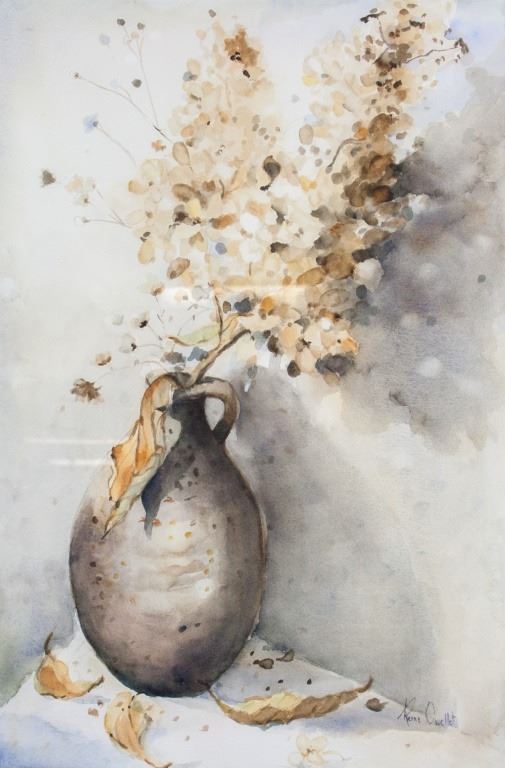 Watercolor on paper, framed. Featuring spray of dried flowers in a narrow mouthed jug. Signed "Rene Ouellet" to the bottom right corner. Paper size: 58 x 39 cm (22.75 x 15.5 inches). Frame size: 81 x 59 cm (32 x 23.25 inches).