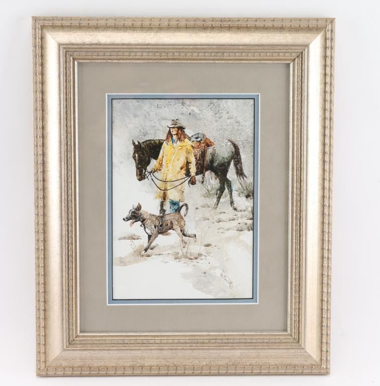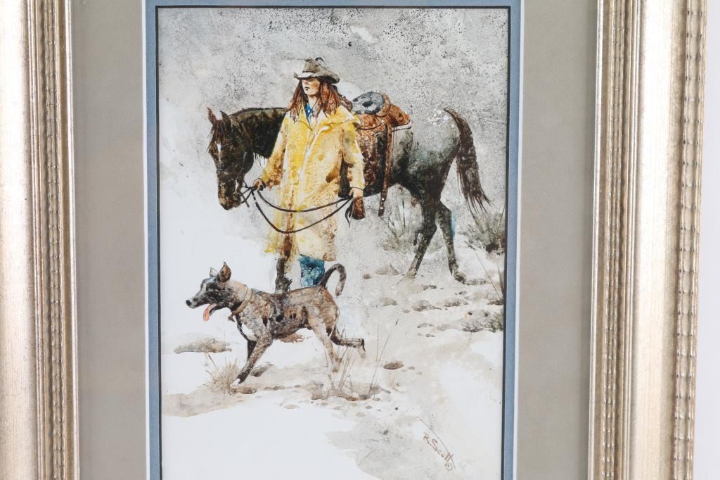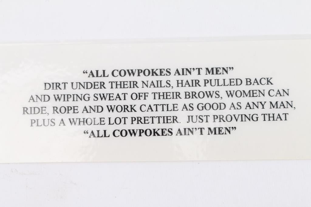 Entitled "All Cowpokes Ain't Men". Triple matted and framed. 10 x 7". R Scott (Roszel) (20th Century) was active/lived in United States. R Scott Roszel is known for Sculpture and Painting.