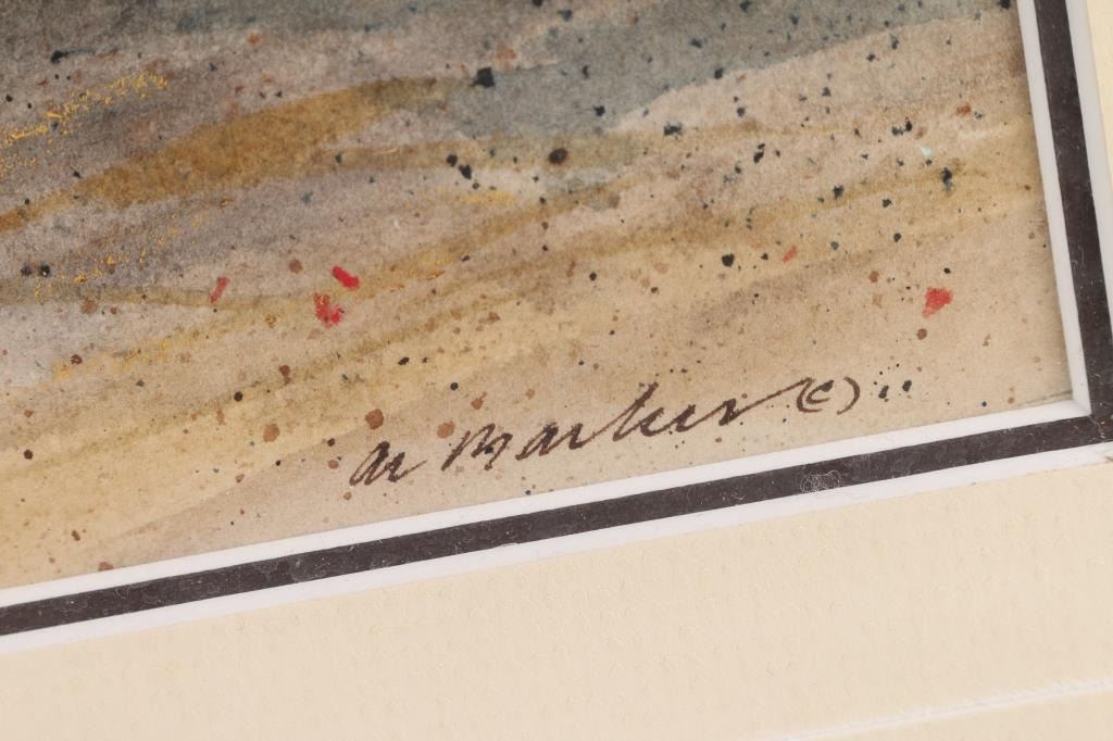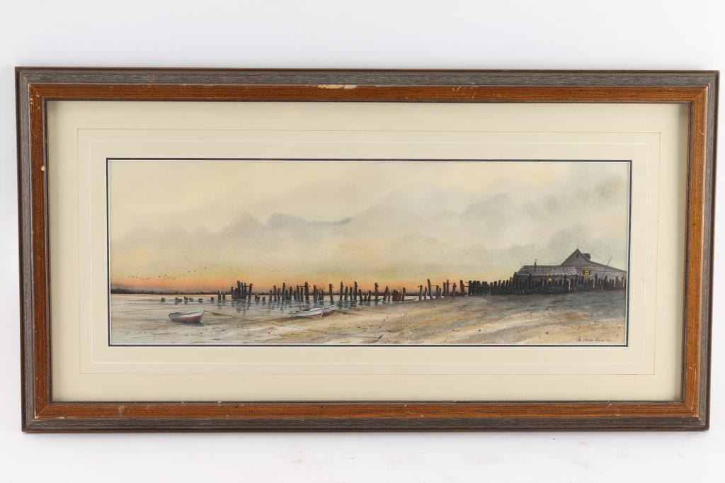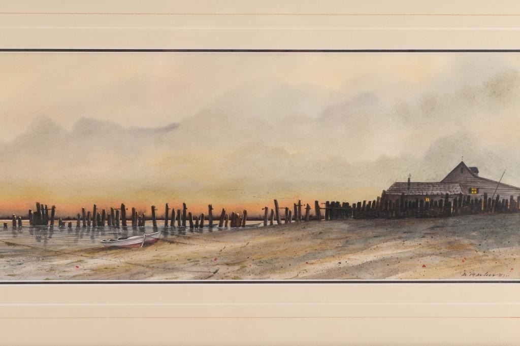 By Al Barker. Signed lower right corner. Depicts a lakeside scene. Double matted and framed. 20 x 7"