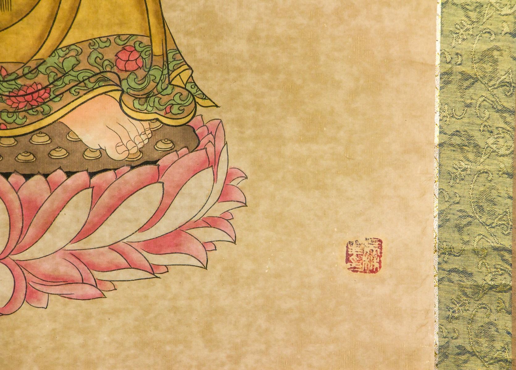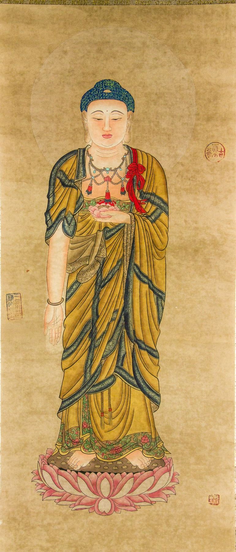 Ink and watercolor on silk; hanging scroll. Featuring Gautama Buddha. Inscribed with three red seals including one San Xi Tang seal; 183 × 61 cm