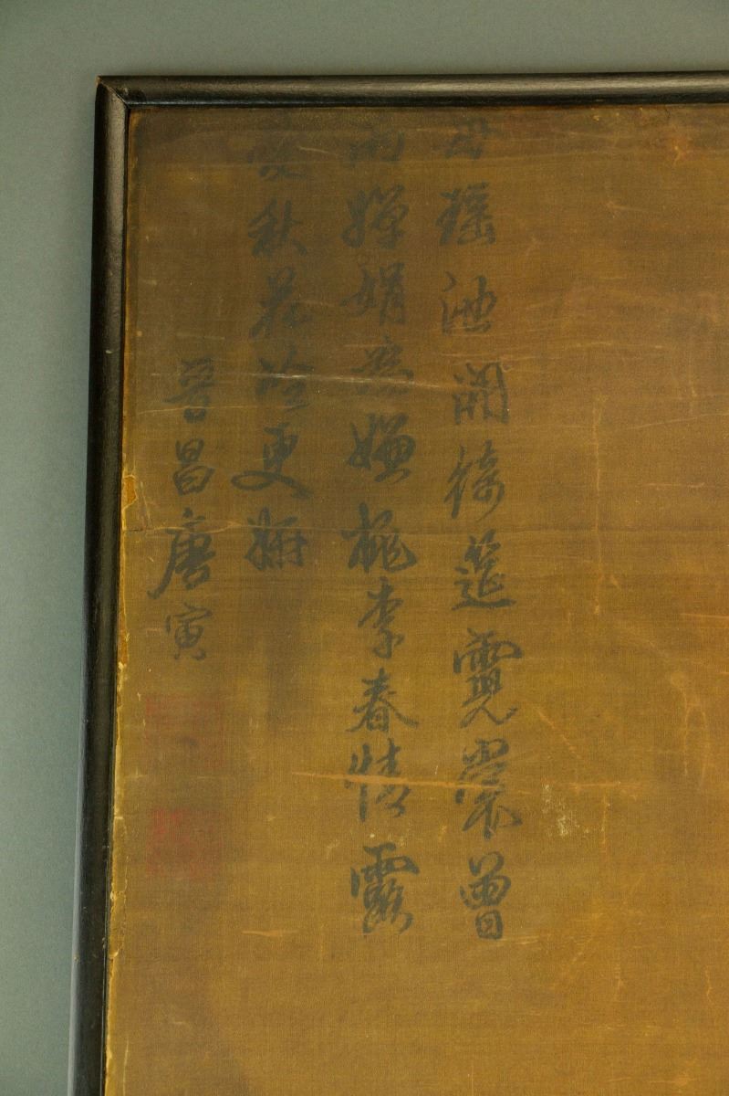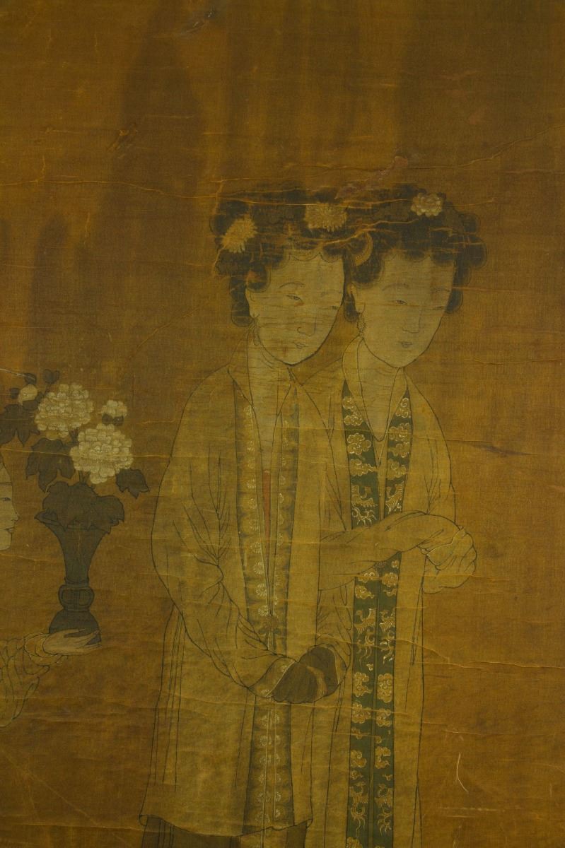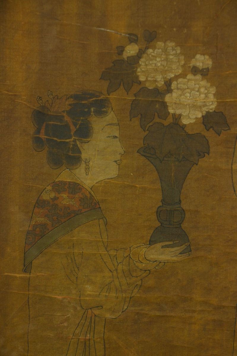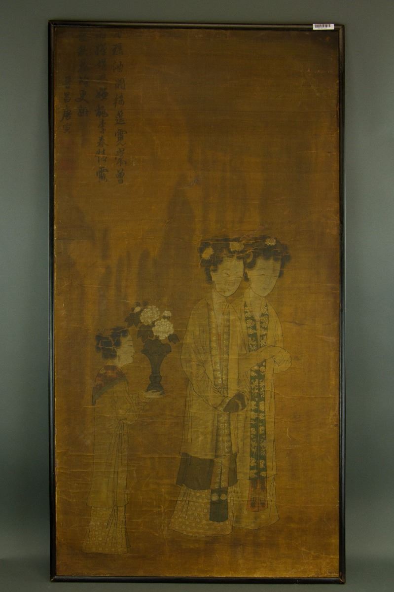 Two ladies followed by their handmaiden; Chinese ink and watercolour on silk; framed; signed Tang Yin and inscribed with two artist seals; 125 cm x 59 cm