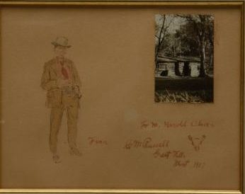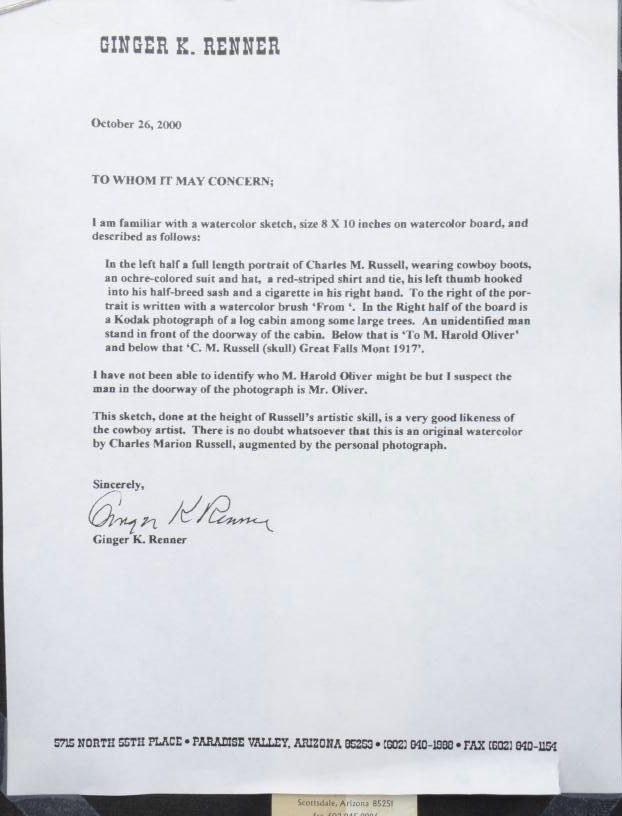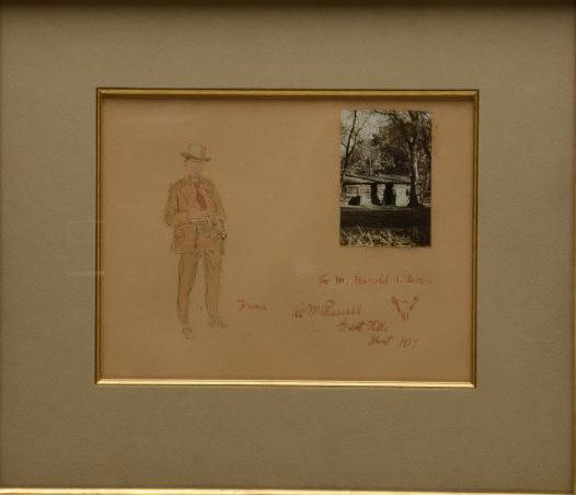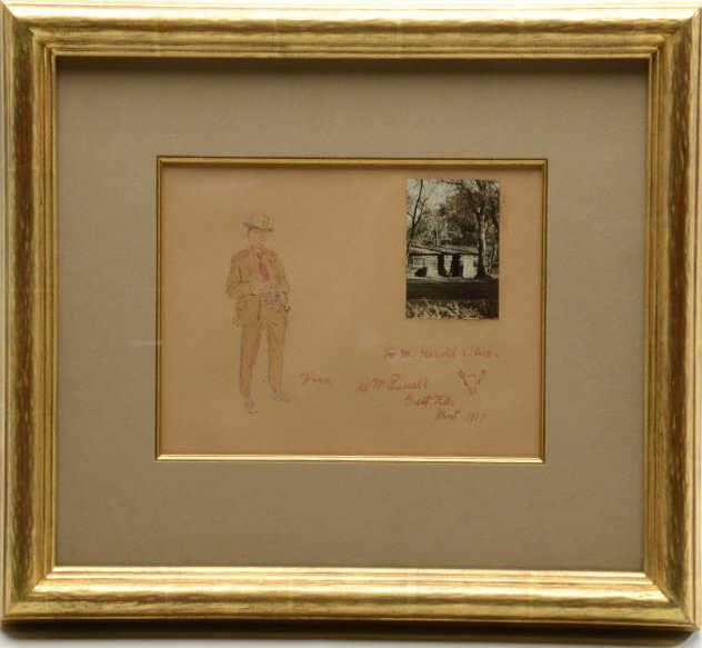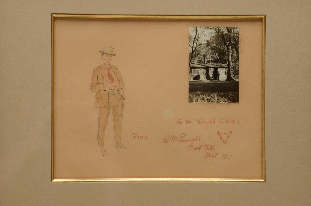 Watercolor on board showing self-portrait of  "Charlie" Russell with inscription "To M.  Harold Oliver From C M Russell Great Falls  Mont 1917" with trail-skull marking,  approximately 8" x 10", nicely framed andmatted.  Letter from Ginger Renner dated  October 26, 2000, describes the painting,  photograph and  inscription, and states this  sketch and watercolor was done at the height  of Russell's artistic skill, and is a verygood likeness of the cowboy artist.  She  further states:  "There is no doubt  whatsoever that this is an original  watercolor by Charles Marion Russell,  augmented by the personal photograph.".    An original sticker on reverse from Biltmore  Galleries of Scottsdale describes the  watercolor, shows Cat.# O-2120, and provides  the provenance from whom our consigner  purchased this artwork.  The condition isvery good and could use slight conservation  and cleaning which would brighten it nicely.   The photograph shows a cabin with a man in  the doorway who is probably Russell himself.   The identity of M. Harold Oliver is unknown,