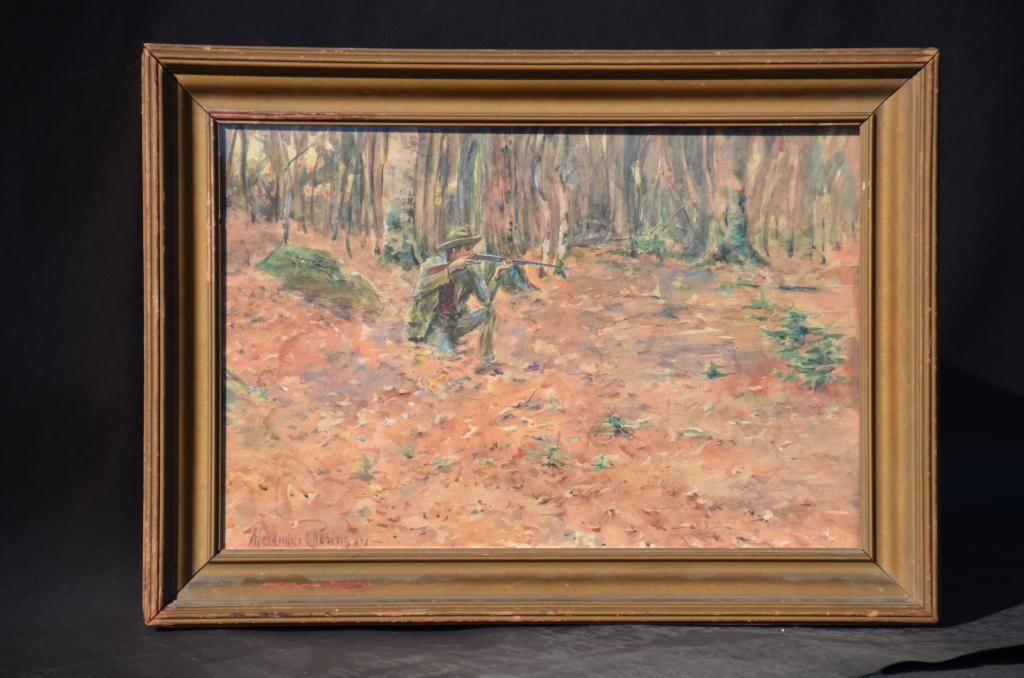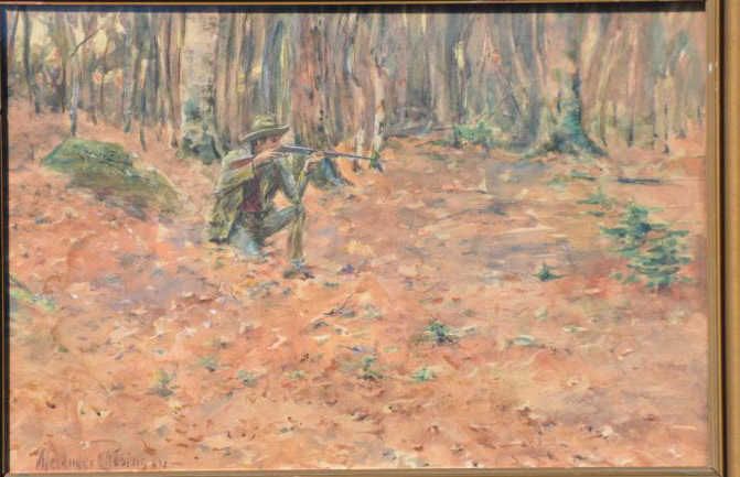 Watercolor on paper signed lower left Alexander C. Robinson. Alexander C. Robinson circa 1867-1940 was from Portsmouth, New Hampshire and he was a pupil of Doucet and Constant and he lived in Paris for a time and was well-known for his quality watercolors. The image measures approximately 12” x 18” and portrays a hunter in the woods with his gun. The condition is good with just some light normal aging and could use some minorcleaning and conservation. Includes an old period frame which maybe it’s original. Est.: $400-$800