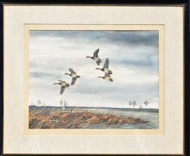 Watercolor on paper, signed lower left, David Hagerbaumer ’64. Measures approx. 16-1/2” x 21-1/2”. David Hagerbaumer is one of the most recognized wildlife artists in American who’s career began in the 1950’s and he wasborn in 1921 in Quincy, IL. Winner of innumerable awards, he may be the best recognized painter of water fowl today. Est.: $1,000-$2,000.