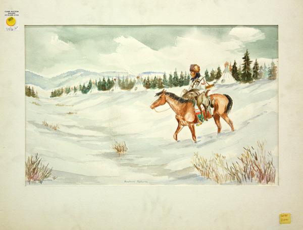 (Lot of 2) Unframed watercolors, ''Hunters Return'' and Indians Walking Through the Snow, by Dan J. Taulbee (American, 1924-1987), each signed ''Dan Taulbee'' lower left, largest overall: 13.75''h x 21.75''w