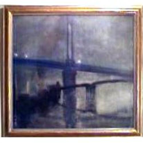 A lovely watercolour here in it's original gilded frame. Subject: Bridge with tug billowing smoke, making it's way towards the bridge.