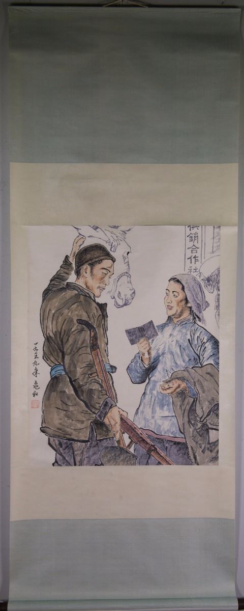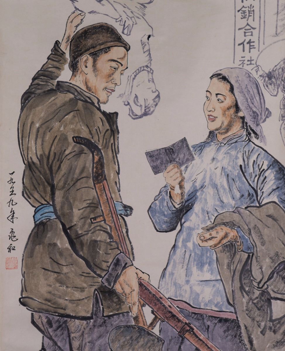 Men and women; Chinese ink and watercolour on paper; hanging scroll; signed Jiang Zhao He (1904-1986) and inscribed with one artist seal, dated 1959; 67 cm x 53 cm