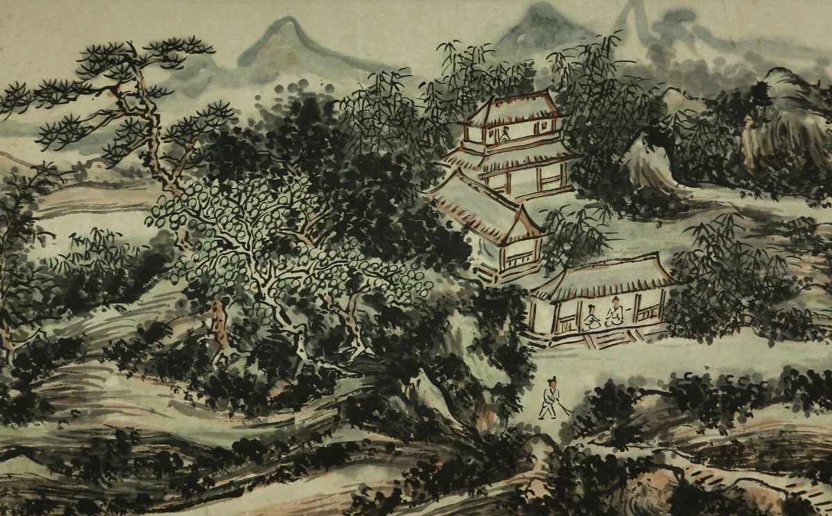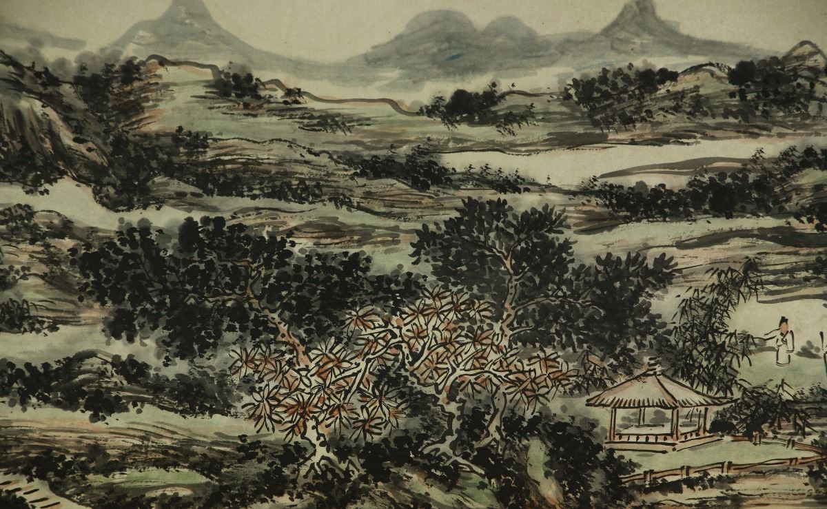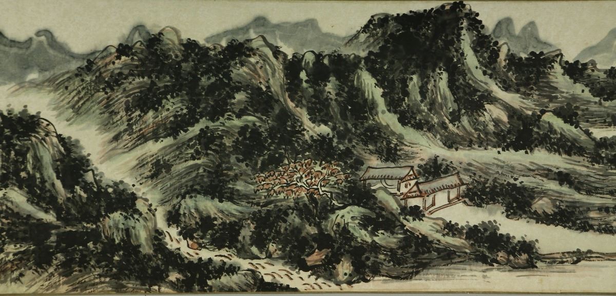 Mountainous landscape; Chinese ink and watercolour on paper; hand scroll; signed Huang Binhong and inscribed with one artist seal; 23 cm × 180 cm