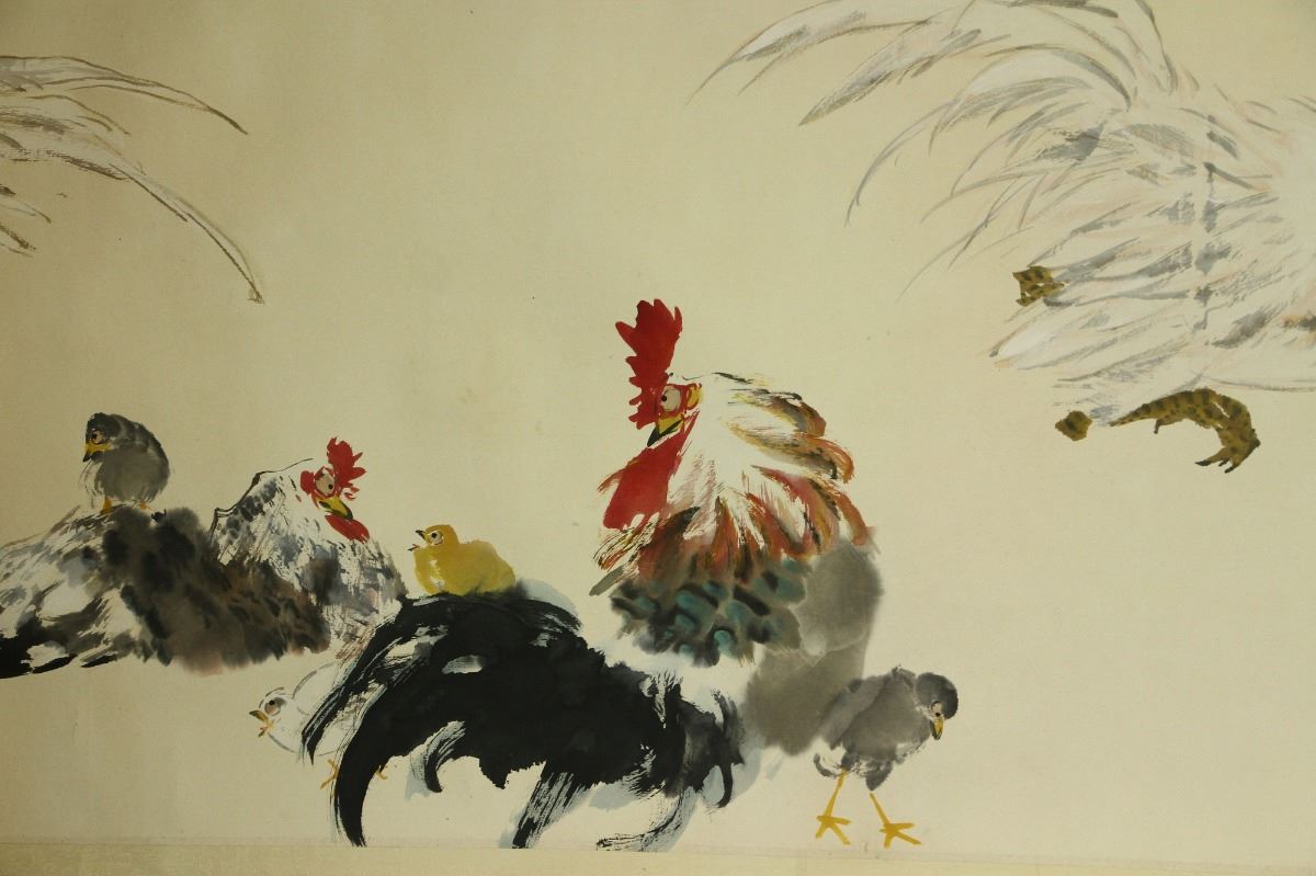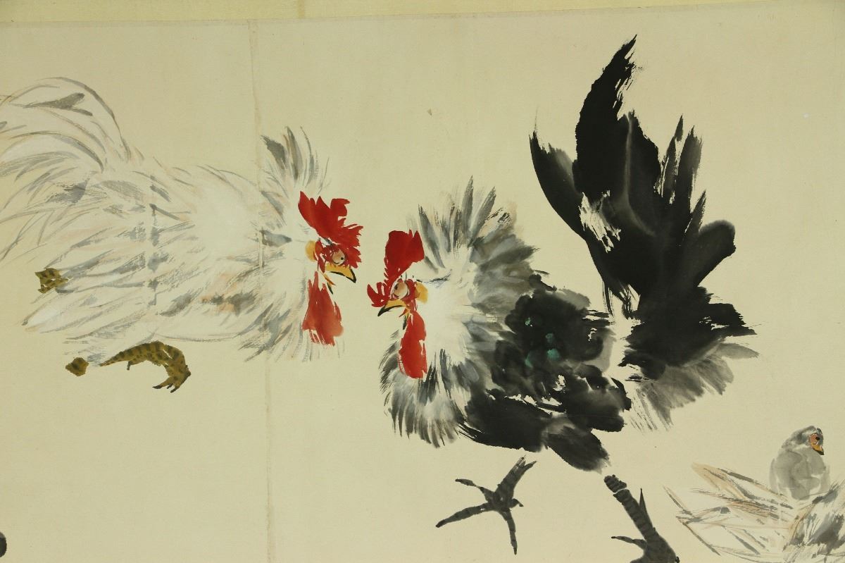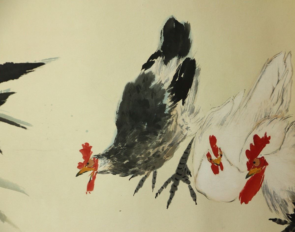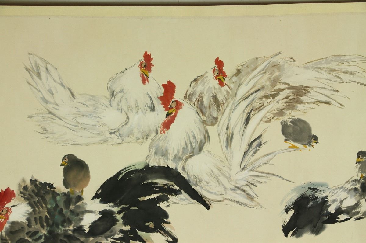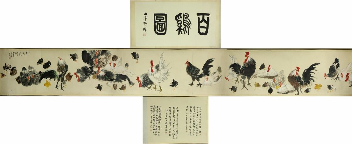 A hundred roosters; Chinese ink and watercolour on paper; hand scroll; signed Wang Xuetao and inscribed with one artist seal; 909 cm x 51 cm