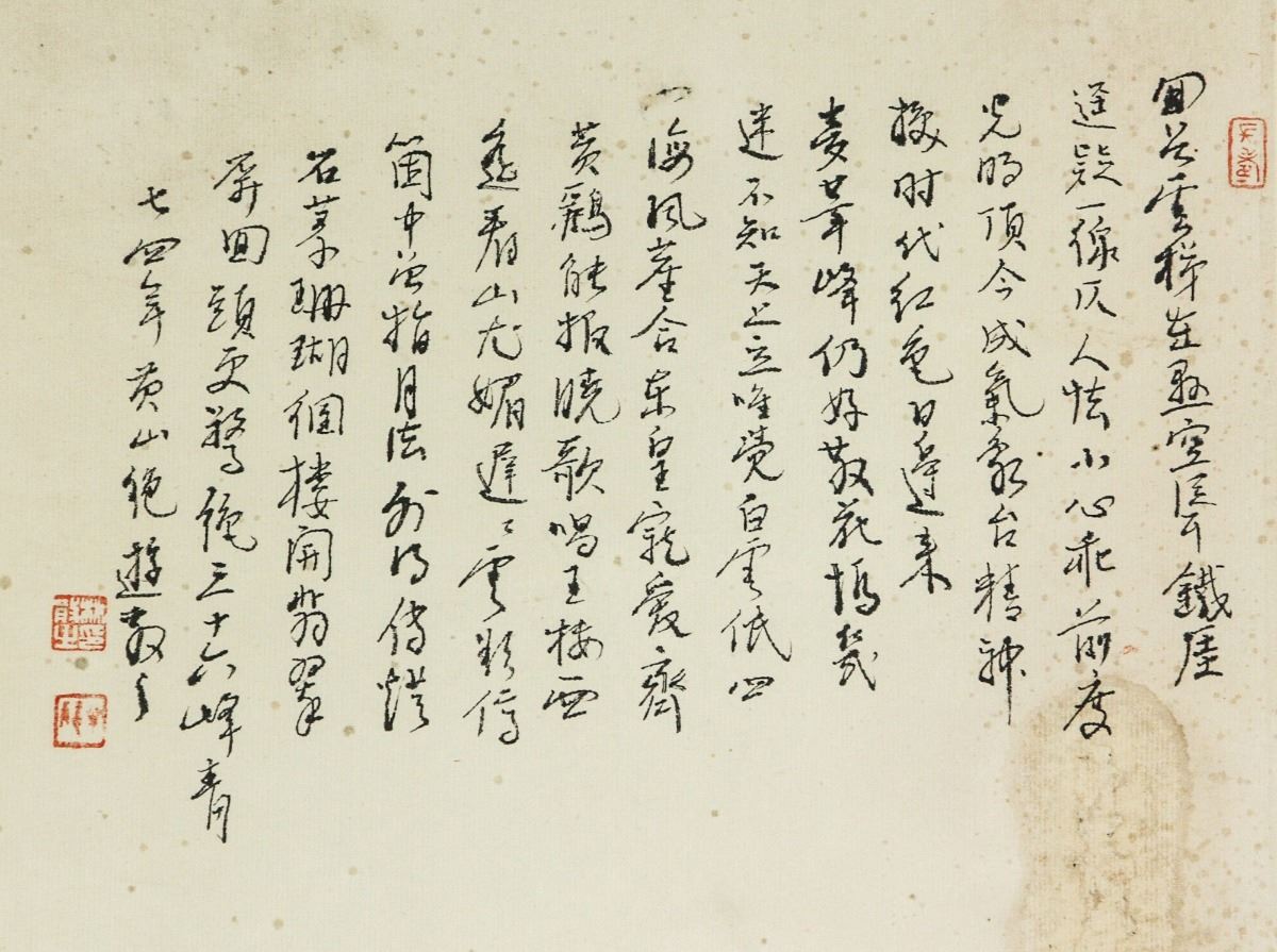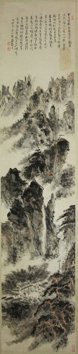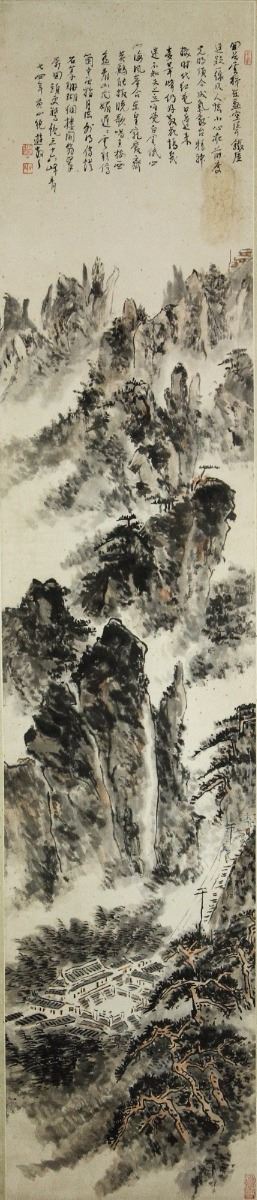 Mountains and pin trees; along with script calligraphy; Chinese ink and watercolour on paper; hanging scroll; signed Lin Sanzhi and inscribed with four artist seals; 137.5 cm X 29 cm