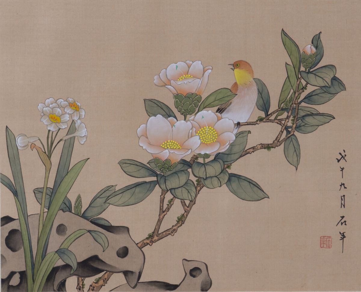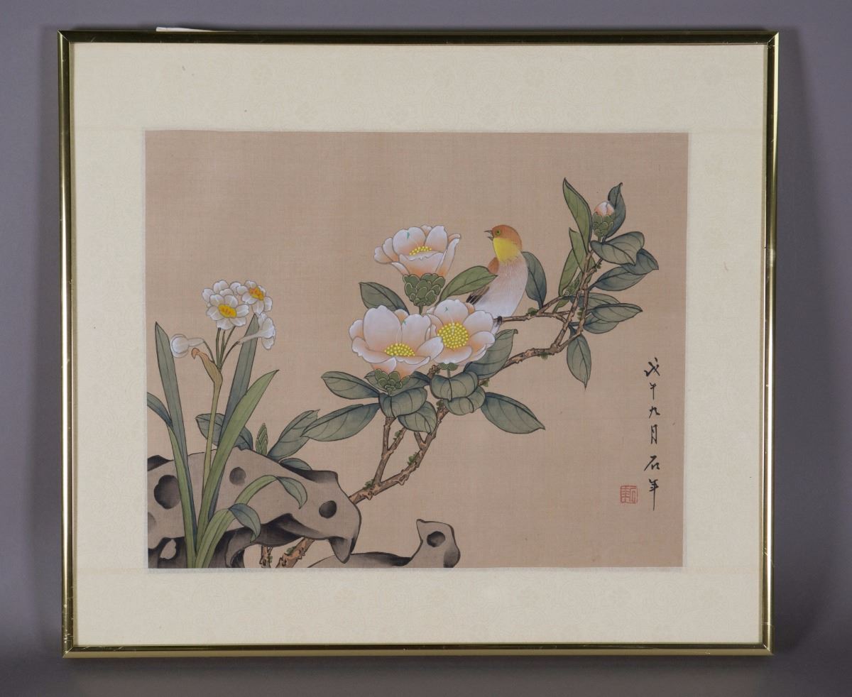 Bird Perched on Branches with Flowers, Chinese ink and watercolour on paper; signed Shi Nian (?-1914) and inscribed with one artist seal; 24 cm x 30 cm