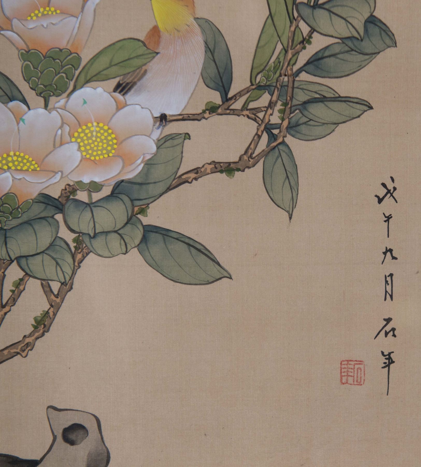 Bird Perched on Branches with Flowers, Chinese ink and watercolour on paper; signed Shi Nian (?-1914) and inscribed with one artist seal; 24 cm x 30 cm