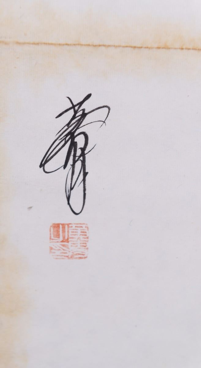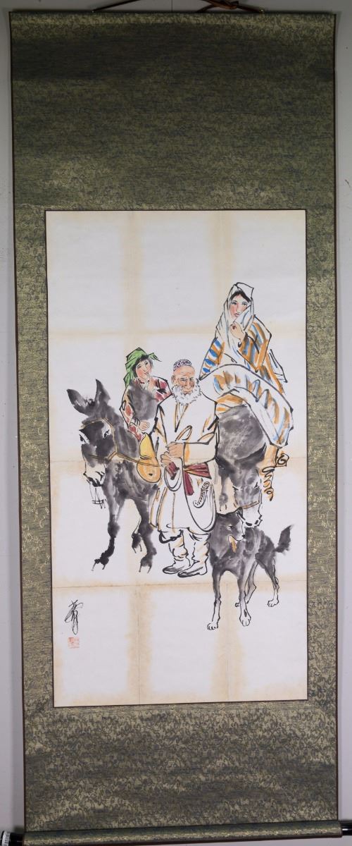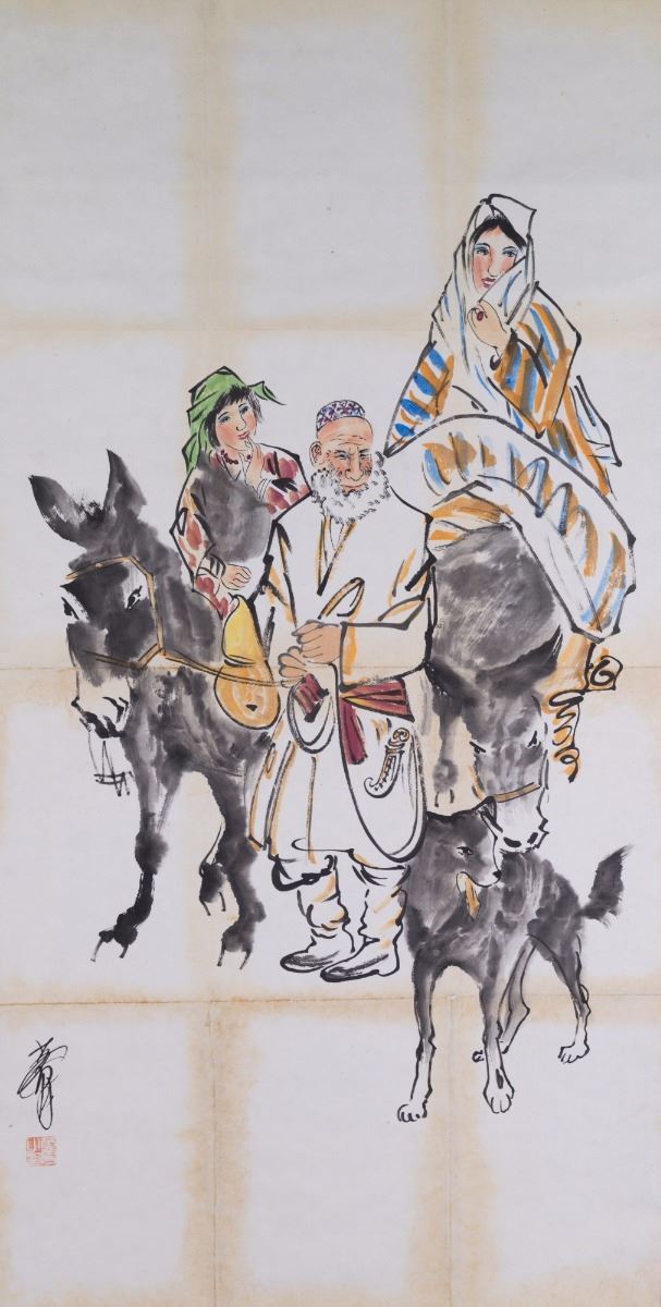 Xinjiang men and women riding donkeys; Chinese ink and watercolour on paper; hanging scroll; signed Huang Zhou and inscribed with one artist seal; 102 cm x 52 cm