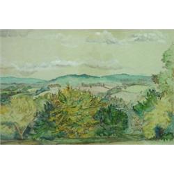 Watercolour of hills, trees and bushes, 42cm x 27cm