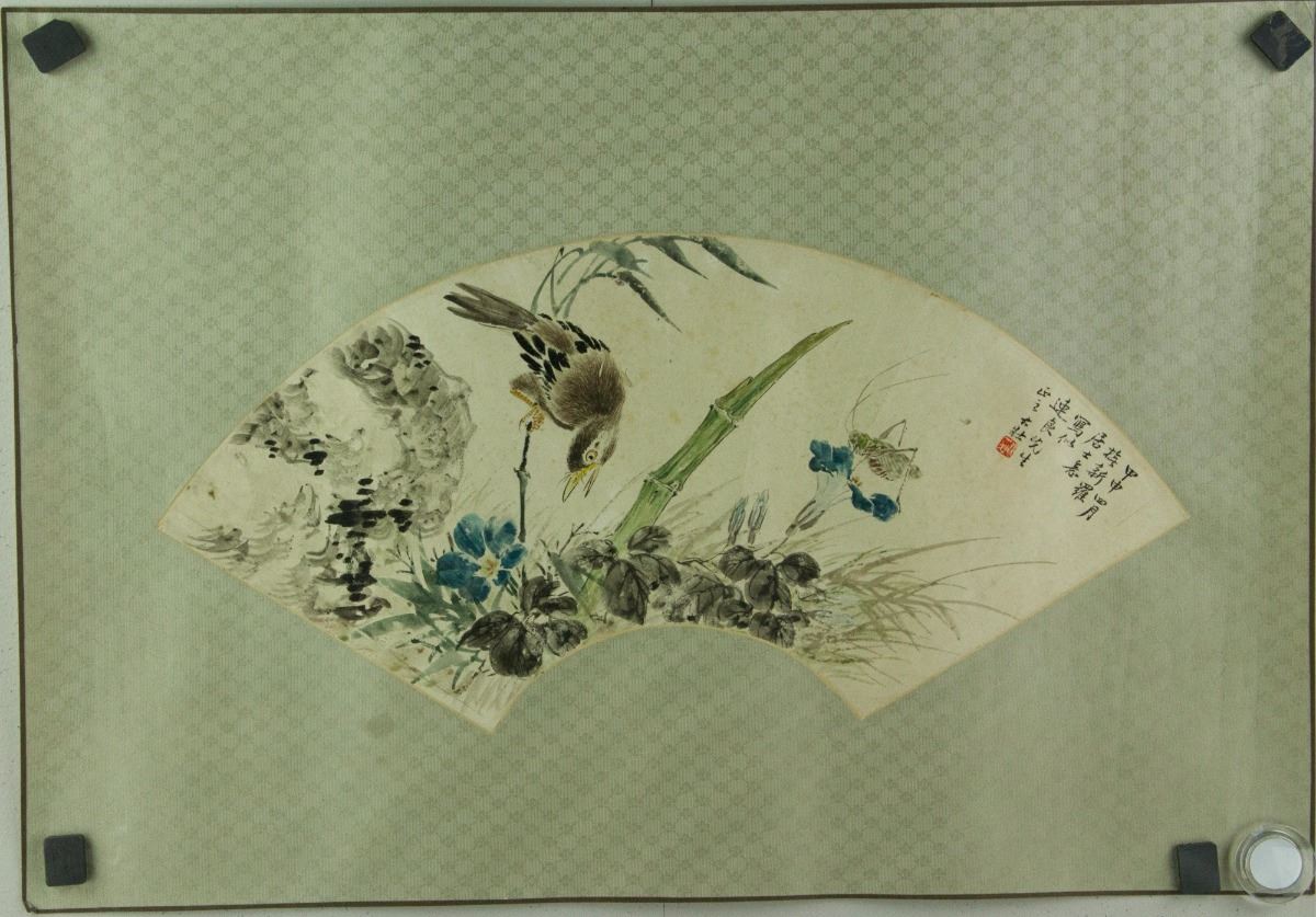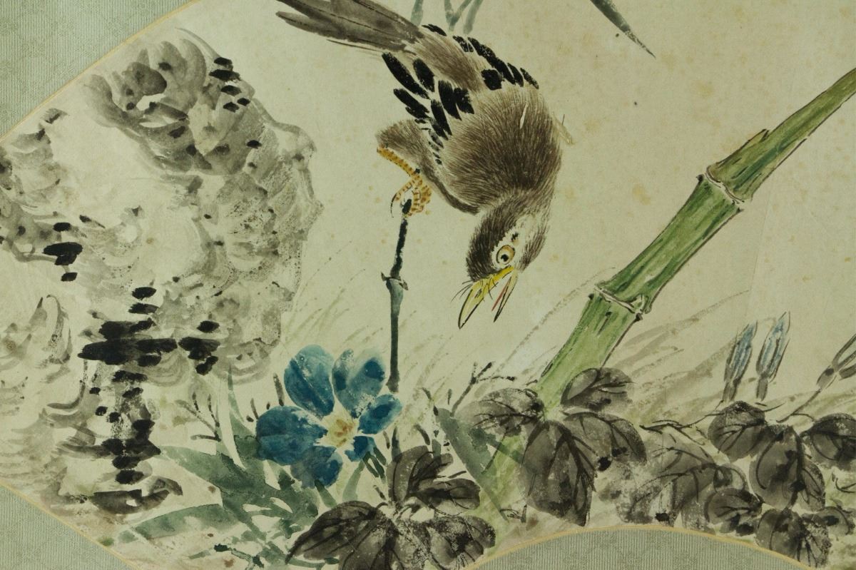 Flowers and birds; Chinese ink and watercolour on fan paper; signed Zhang Dazhuang and inscribed with one artist seal; 20 cm x 52 cm