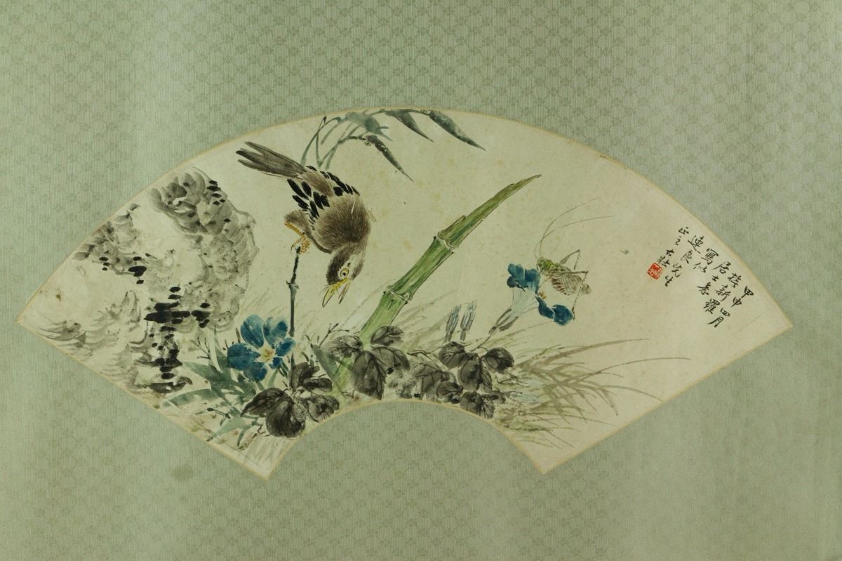 Flowers and birds; Chinese ink and watercolour on fan paper; signed Zhang Dazhuang and inscribed with one artist seal; 20 cm x 52 cm