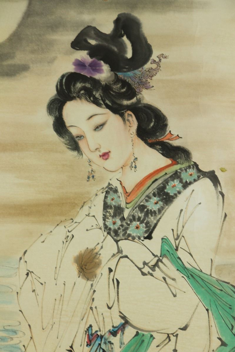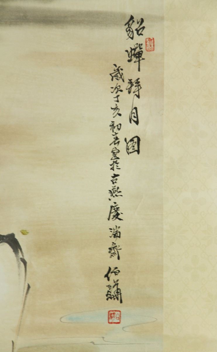 Diaochan worshipping the moon; Chinese ink and watercolour on paper; signed Bai Bohua and inscribed with three artist seals; 167 cm × 82 cm