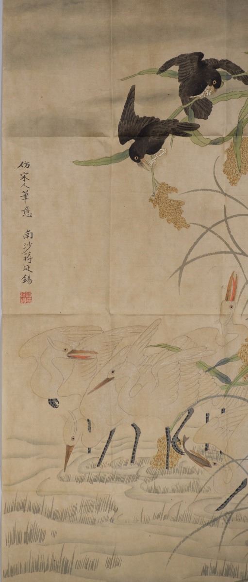 White cranes and birds; Chinese watercolour and ink on paper; signed Jiang Ting Xi and inscribed with one artist seal; 90 cm x 42 cm