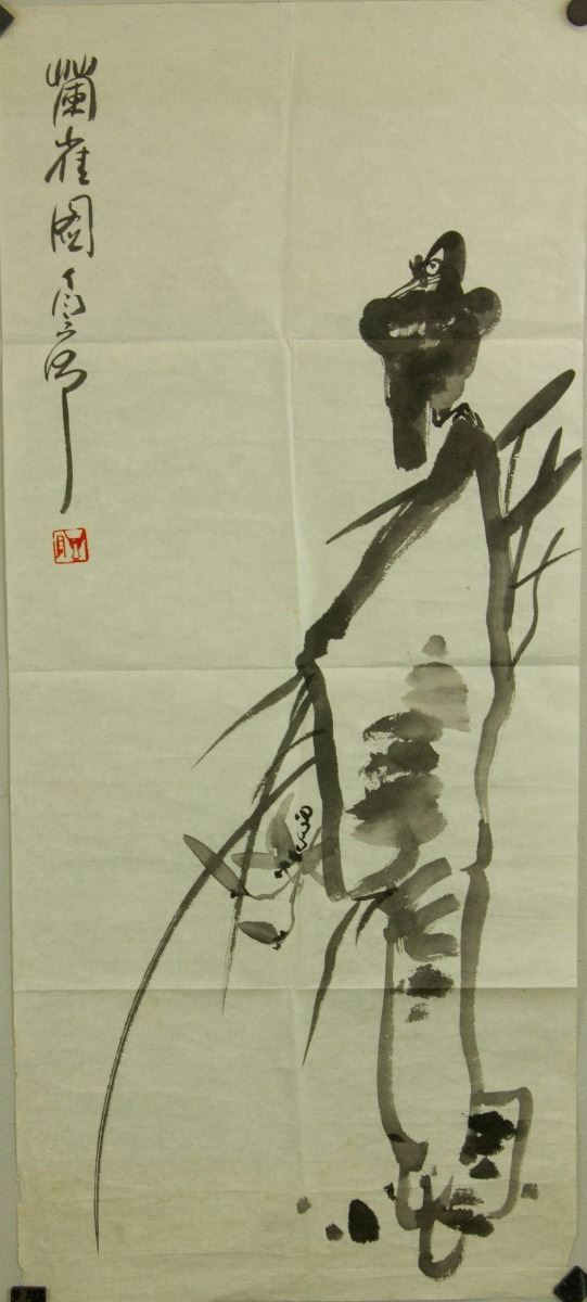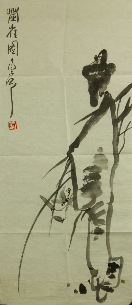 Crow and orchid; Chinese ink on paper; signed Ding Yanyong and inscribed with one artist seal; 91 cm × 38 cm